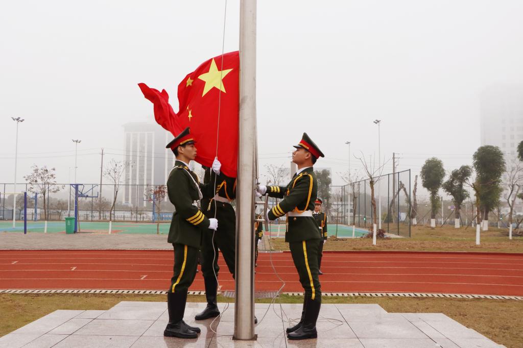 上午8时,学校国旗护卫队队员迈着整齐有力的步伐,将国旗护送至升旗台。伴随着雄壮激昂的《义勇军进行曲》,鲜艳的五星红旗冉冉升起。全场师生庄严肃立,齐唱国歌,面向国旗行注目礼。