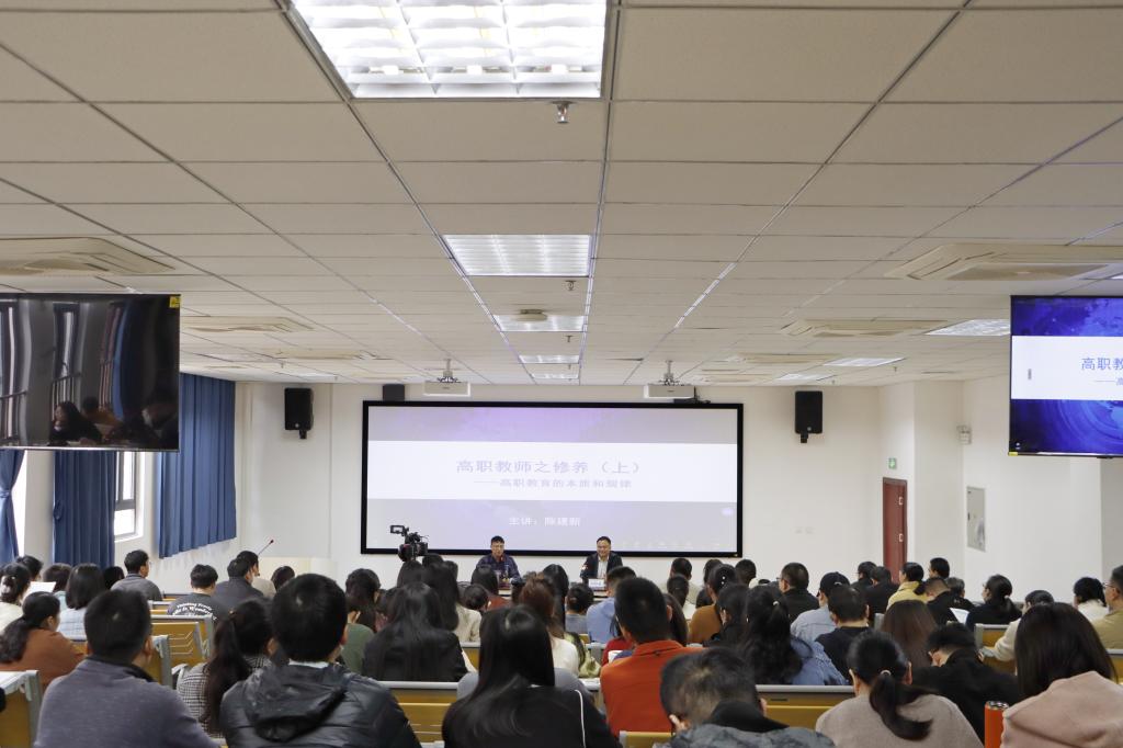 陈建新教授讲授的高职教师之修养系列培训分为上、中、下三期,围绕学校的发展和高职教师的素质培养主题开展,他强调,“师资是高职办学最重要的支持体系,处于中心地位,是高职院校的核心竞争力”。他鼓励我校教师努力提升职业素质,找准发展之路,融入学校的发展中。在第一期的培训中,主要讲解了高职教育的本质和规律,包括什么是教育、什么是大学、什么是职业教育、普通教育与职业教育、职业教育的办学逻辑、高职教育的组织和规范——高职办学的五大支柱等内容。在第二期的培训中,主要讲授了高职教师应具备的素质,包括现代职业教育的路径选择、高职师资的地位和作用、高职人才培养目标与师资水平的逻辑、高职教师的法规及规范、师资的“双师”能力、师资的“专兼”结构、师资的管理等内容。在第三期中,主要讲授了高职教师的培育和养成,包括南宁职业技术学院崛起的启示、德国职业教师养成的经验借鉴、“双师”素质的培养、“专兼结构”的形成、高职师资队伍建设的构建途径、校企合作对高职教师的意义等内容。
