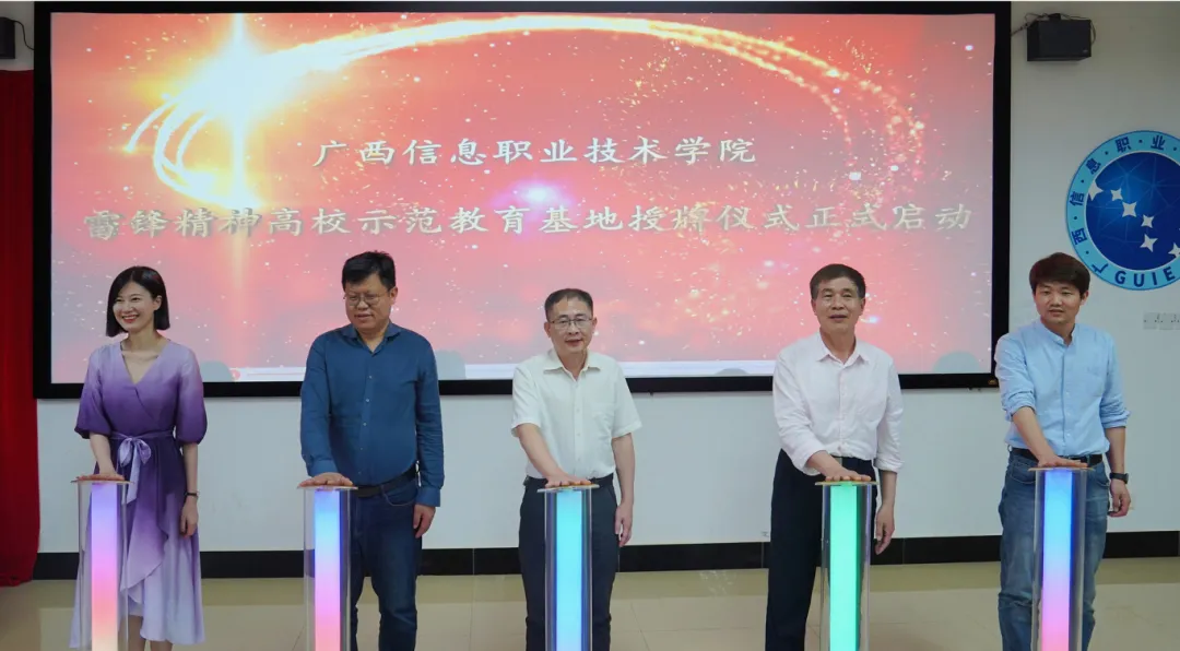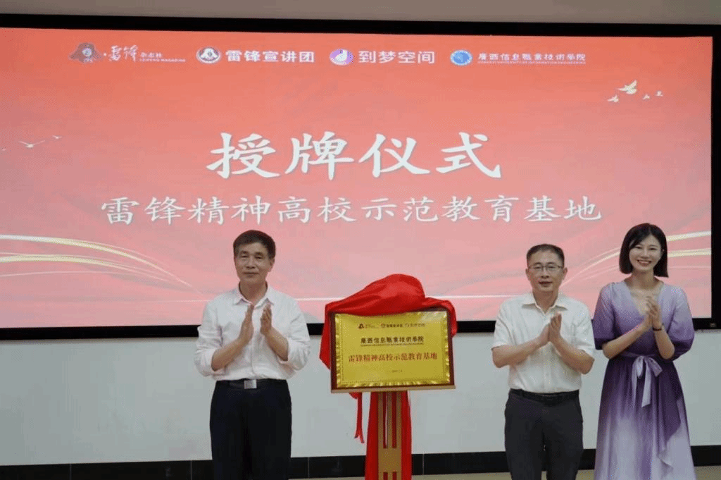 在与会人员的见证下,与会领导上台共同为授牌仪式按下启动按钮,《雷锋》杂志社组委会向我校授发“雷锋精神高校示范教育基地”牌匾,这也标志着广西信息职业技术学院成为雷锋精神实践传播的示范阵地。