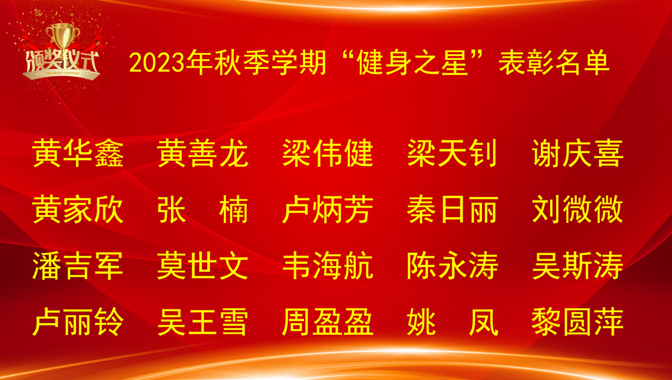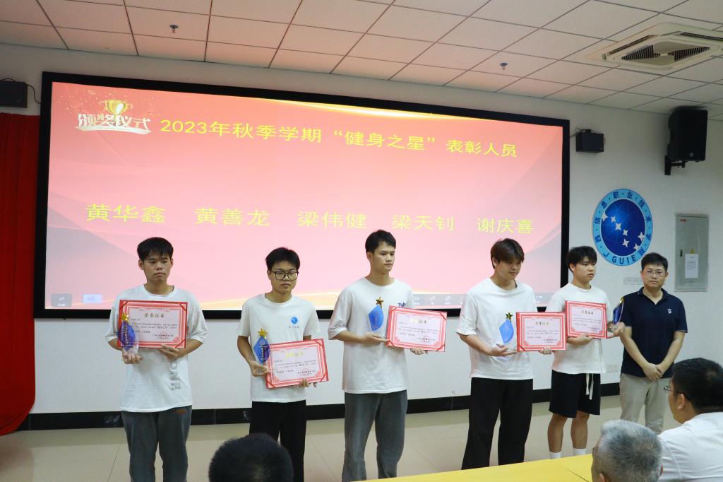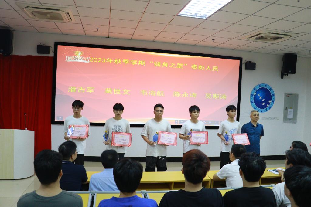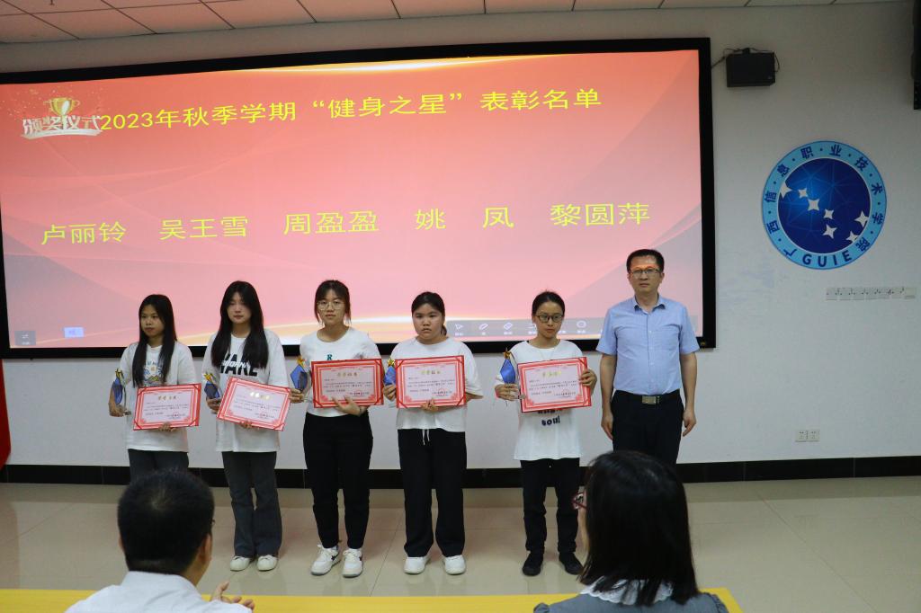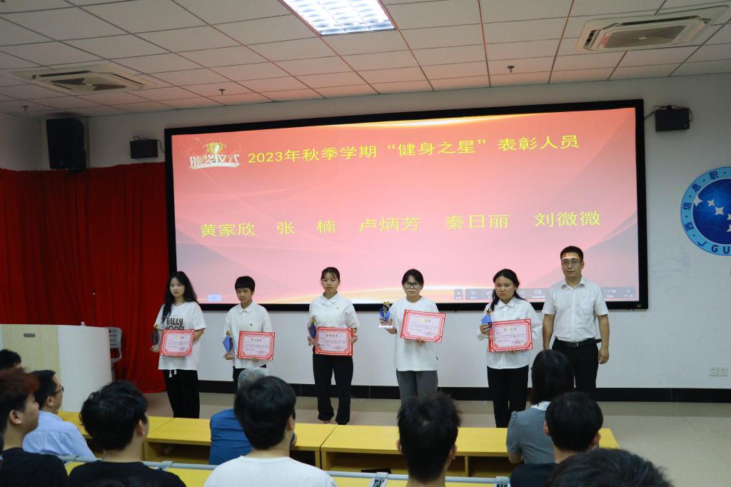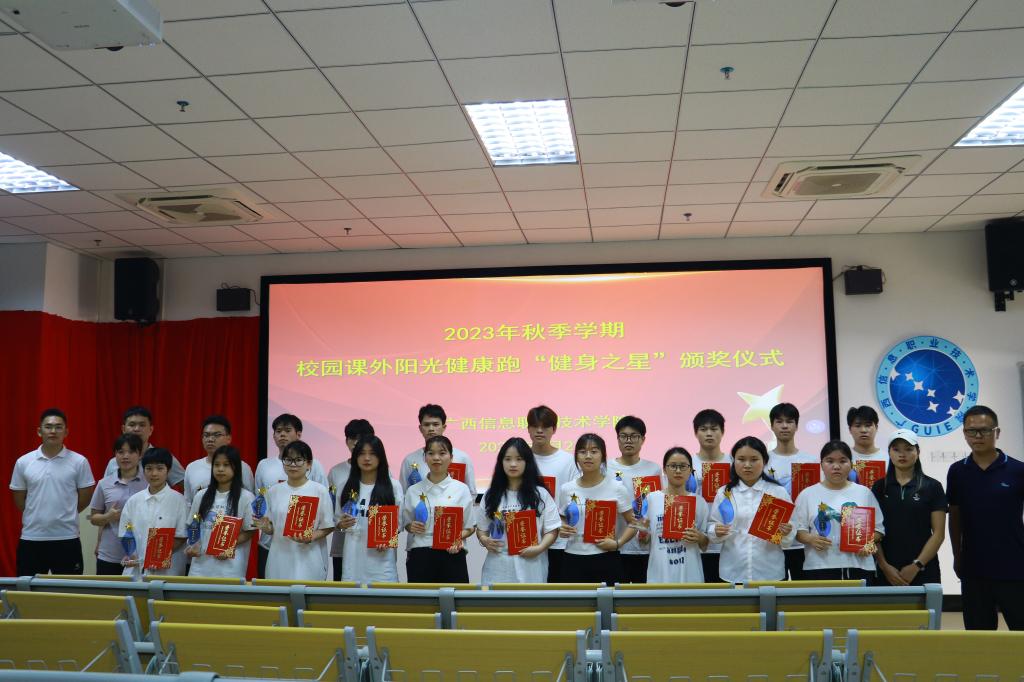 会上,公共教学部主任韦览恩宣读《广西信息职业技术学院关于表彰2023年秋季学期校园课外阳光健康跑“健身之星”的通知》及“健身之星”表彰名单。她号召全体师生向获奖同学学习,积极参与体育运动,按时按量完成校园课外阳光健康跑,提高身体素质,自觉养成参加体育锻炼的习惯。
