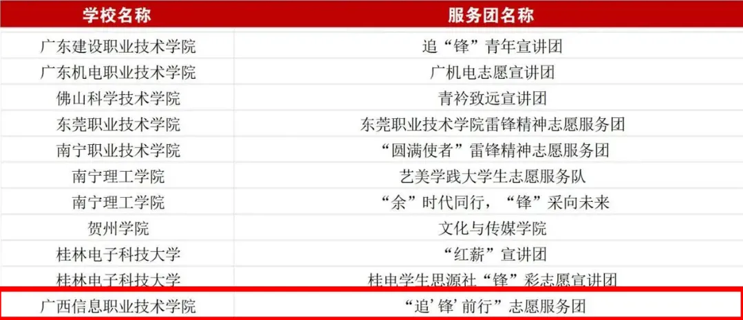 近日,团中央到梦空间系统运营中心公布“2024 年大学生弘扬雷锋精神志愿服务系列活动”获奖名单。广西信息职业技术学院校团委指导的“追‘锋’前行”志愿服务团成功入选2024年全国雷锋精神志愿服务团。