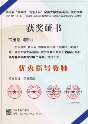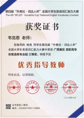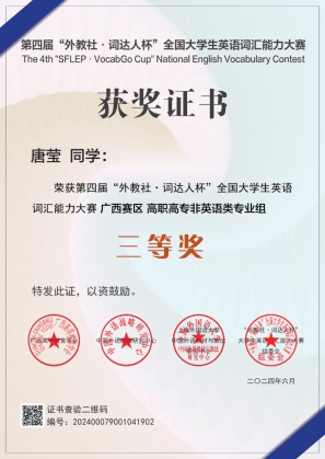 公共教学部 赵冬 报道 近日,我校学子在第四届“外教社·词达人杯”全国大学生英语词汇能力大赛广西赛区夺得佳绩,囊括省(区)赛二等奖、三等奖。