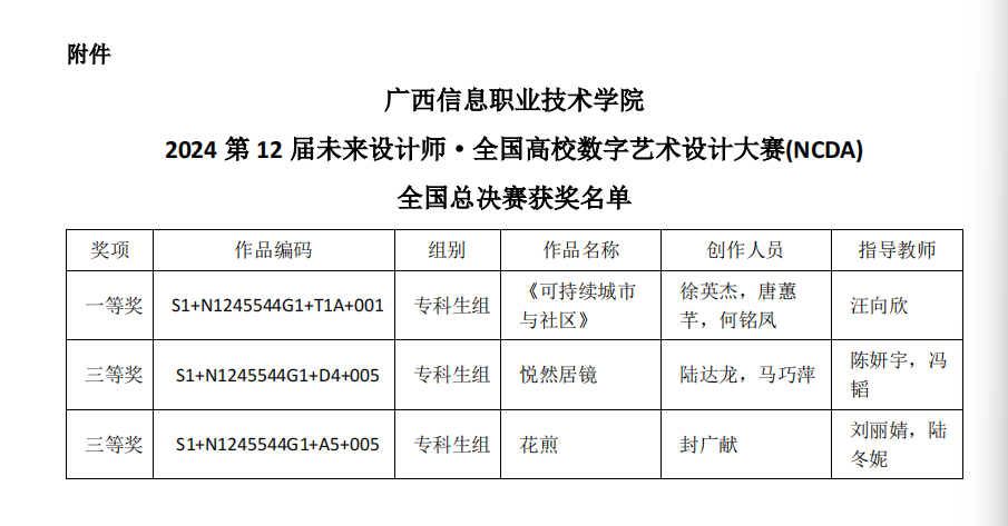 数字艺术与传媒学院 汪向欣报道 8月26日,从2024年度第十二届未来设计师·全国高校数字艺术设计大赛(NCDA)传来喜讯,我校数字艺术与传媒学院教师汪向欣指导的联合国可持续发展设计作品《可持续城市与社区》获得全国总决赛一等奖,教师陈妍宇、冯韬指导的人居环境规划与设计作品《悦然居镜》和刘丽婧、陆冬妮指导的视觉传达设计作品《花煎》均获得全国总决赛三等奖。