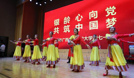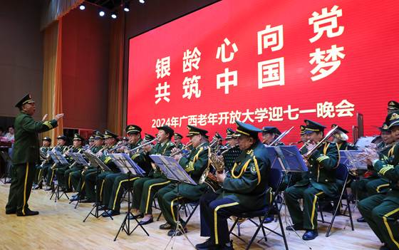 社区教育学院 何晓娜 报道 为弘扬伟大建党精神,激发全校师生爱党、爱国、爱校情怀,展示老年学员积极向上的精神风貌,6月30日,广西老年开放大学举办“银龄心向党 共筑中国梦”迎七一文艺晚会。广西开放大学校长王兴辉,党委副书记龙雪津,副校长黄鹄、辛立章出席晚会,学校组织部、宣传部、工会等部门负责人及部分老年学员代表现场观看晚会。
