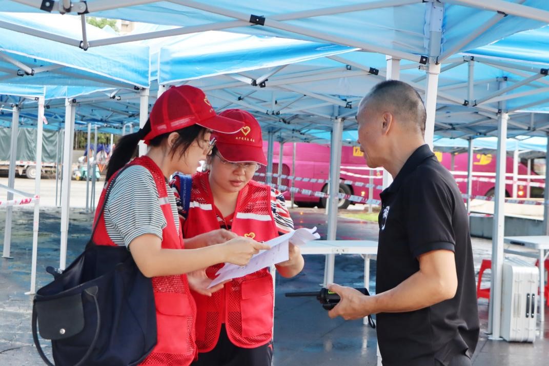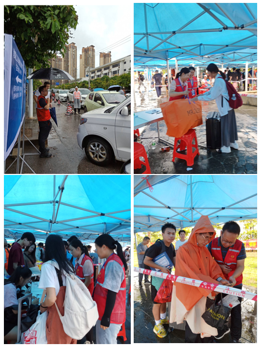 新生开学当天,超强台风“摩羯”来袭,给迎新工作带来较大压力。上午7时,身穿红色志愿者马甲的党员、教师志愿者已在校门口集中,等候着大一新生及家长的到来。新生陆续到达,负责校园车辆引导的先锋队员主动作为,疏导交通,为新生和家长们指引入校通道;负责校园治安的先锋队员不容懈怠,加强巡逻,在人员流动大的情况下时刻避免可能出现的突发状况;负责核查身份信息的先锋队员用心服务,在校门口迎接新生,为学生撑伞、提行李,尽力提供帮助,耐心引导新生完成报到流程。