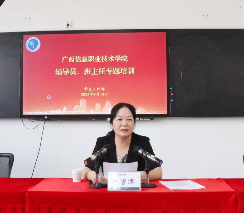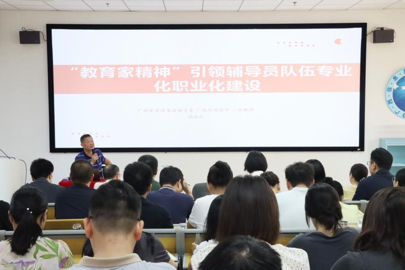 学生工作部 温舒琳报道 为提升辅导员、班主任的专业素养和业务能力,进一步明确职责使命,提升工作效能,9月14日上午,学校邀请桂林航天工业学院副校长胡泽民为全体辅导员和班主任作题为“教育家精神引领辅导员队伍专业化职业化建设”专题培训。学校党委副书记龙雪津出席培训并讲话,广西信息职业技术学院副院长陈广杰主持,各二级学院党总支书记、副书记,全体辅导员、班主任参加。
