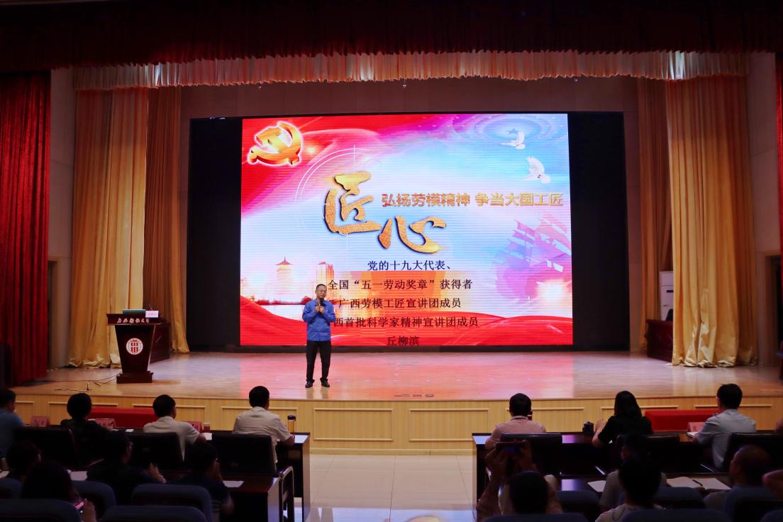 党委宣传部 报道 9月23日,学校举行“中国共产党人精神谱系”宣讲报告会。广西汽车集团有限公司首席技能专家、学校2011级工商管理专业优秀校友丘柳滨以《弘扬劳模精神 争当大国工匠》为题作宣讲报告。