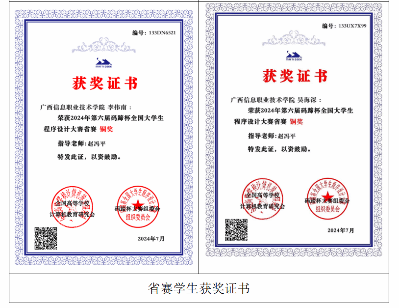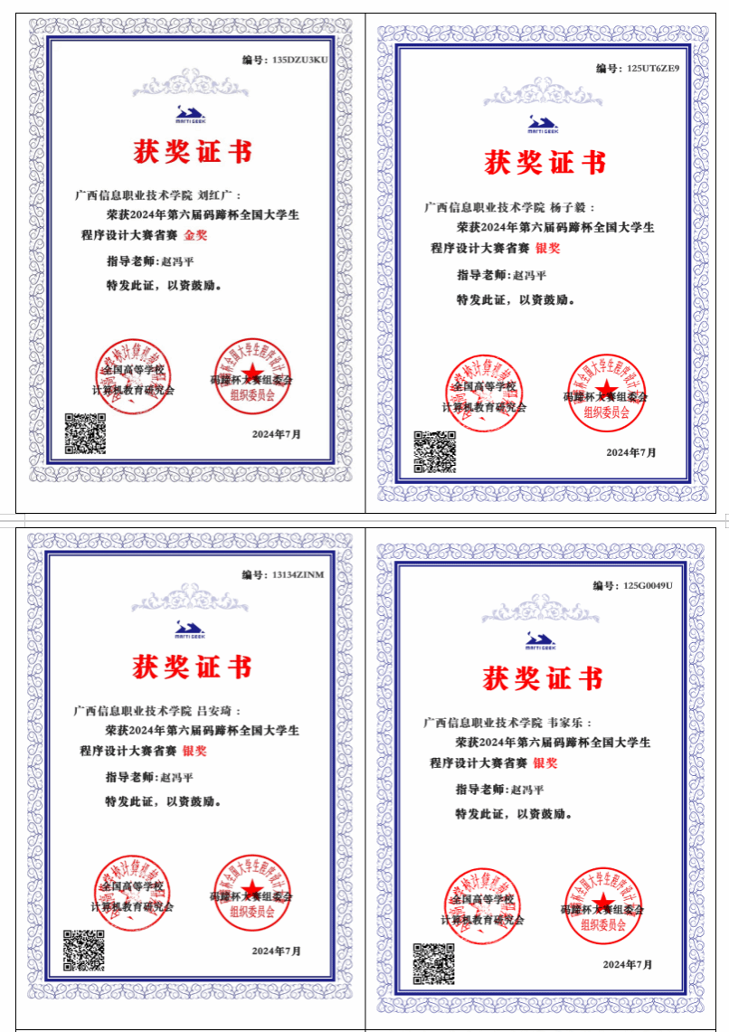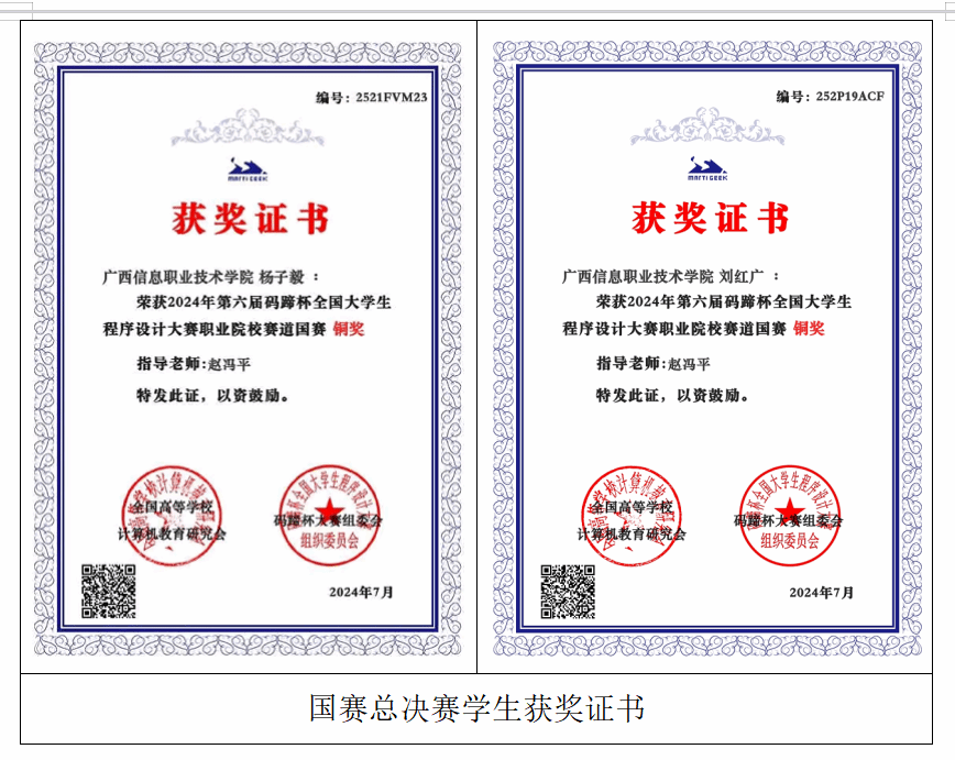 此前,我校计算机与人工智能学院在2024年第九届团体程序设计天梯赛及第七届广西大学生程序设计大赛区内高职组中夺冠。在6月举行的省赛中,我校学生便以优异的表现荣获金奖1项、银奖3项、铜奖2项,共有6名同学成功晋级全国决赛。