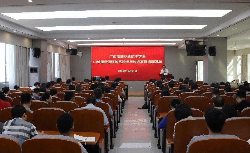 质量管理中心 黄丽婷报道 为进一步明确学校内部质量保证体系诊改与复核要求,精准做好诊断与改进工作,10月24日下午,学校举办了内部质量保证体系诊断与改进复核工作培训讲座。培训讲座邀请到广西诊改专家委员会主任、中国职教学会高职分会副会长、广西壮族自治区人民政府督学顾问韩志刚教授前来授课。全体校领导,全体科级及以上干部参加了此次培训讲座。校长王兴辉主持培训讲座。