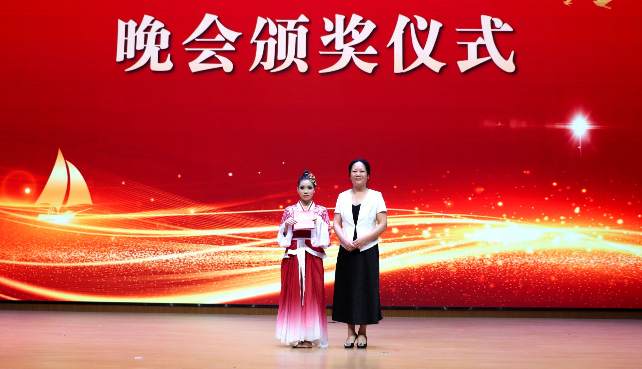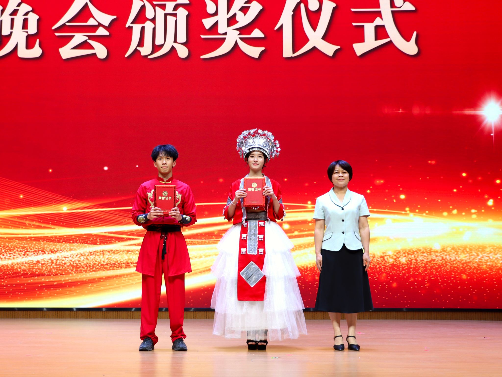 广西信息职业技术学院副院长黄河、李国助为节目三等奖获得者颁奖