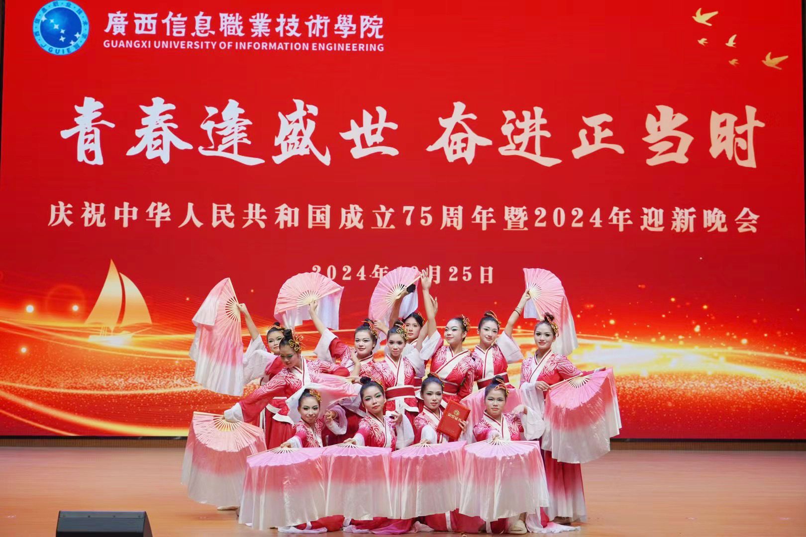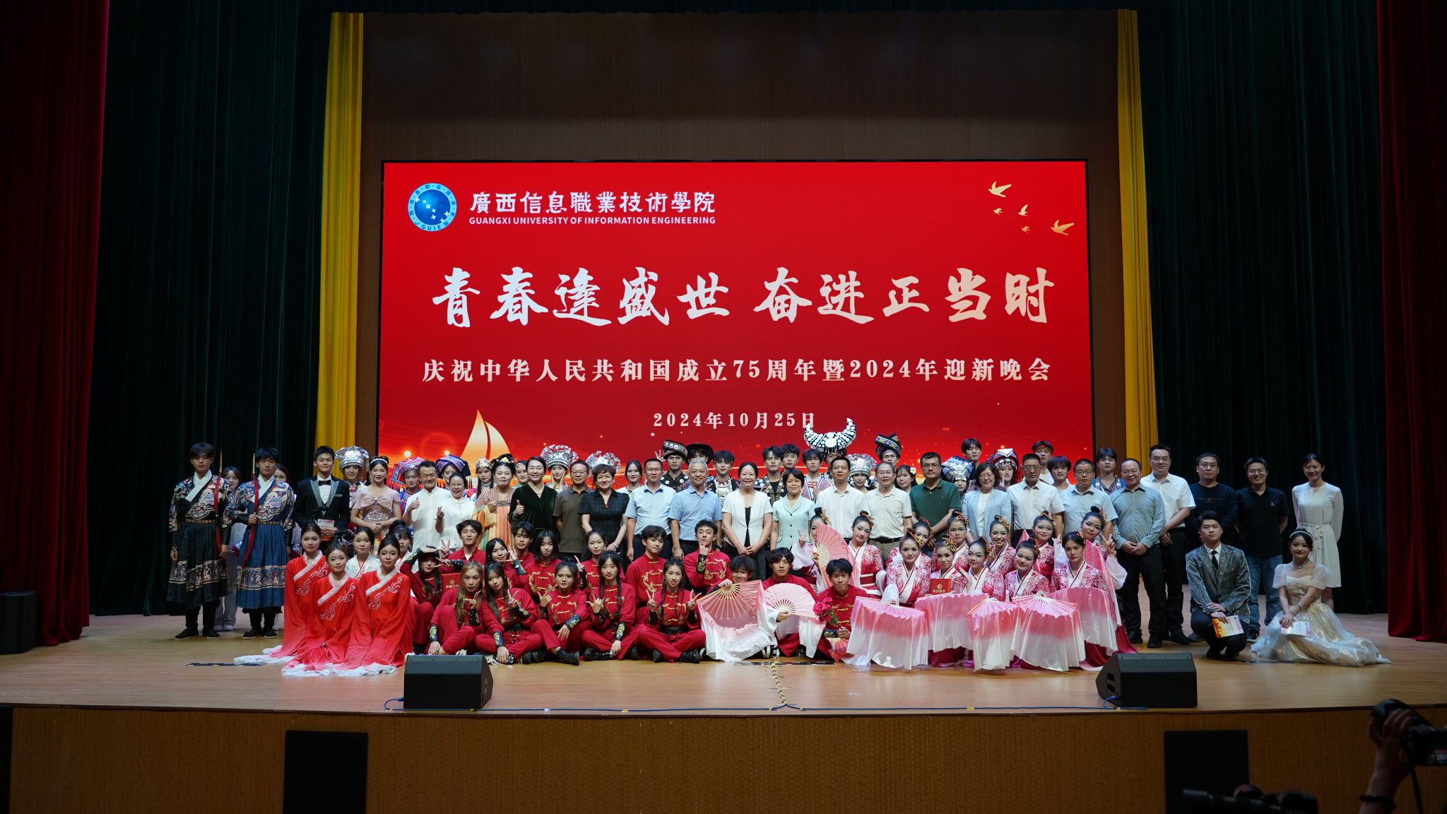 校团委 温舒琳 欧淑玲报道 10月25日晚,学校“青春逢盛世 奋进正当时”庆祝中华人民共和国成立75周年暨2024年迎新晚会在五象校区学生活动中心举行。广西开放大学党委副书记龙雪津,广西开放大学党委委员、组织部部长、广西信息职业技术学院党委副书记陈雪松,广西信息职业技术学院副院长黄河、李国助、邓明学、陈广杰与新生代表齐聚一堂,共赴青春盛会。