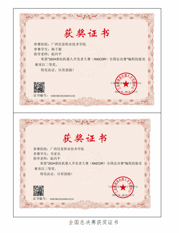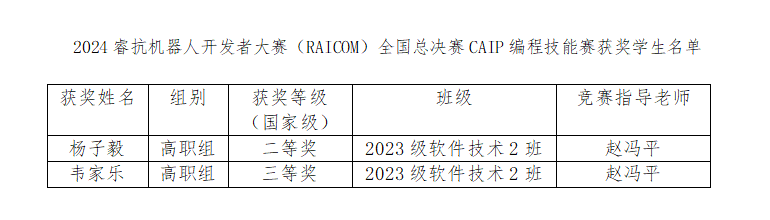计算机与人工智能学院 刘明权 报道 在2024年睿抗机器人开发者大赛(RAICOM)全国总决赛中,我校学生杨子毅、韦家乐在编程技能竞赛项目中分别获得二等奖和三等奖,这是我校首次组织学生参加这一赛事。
