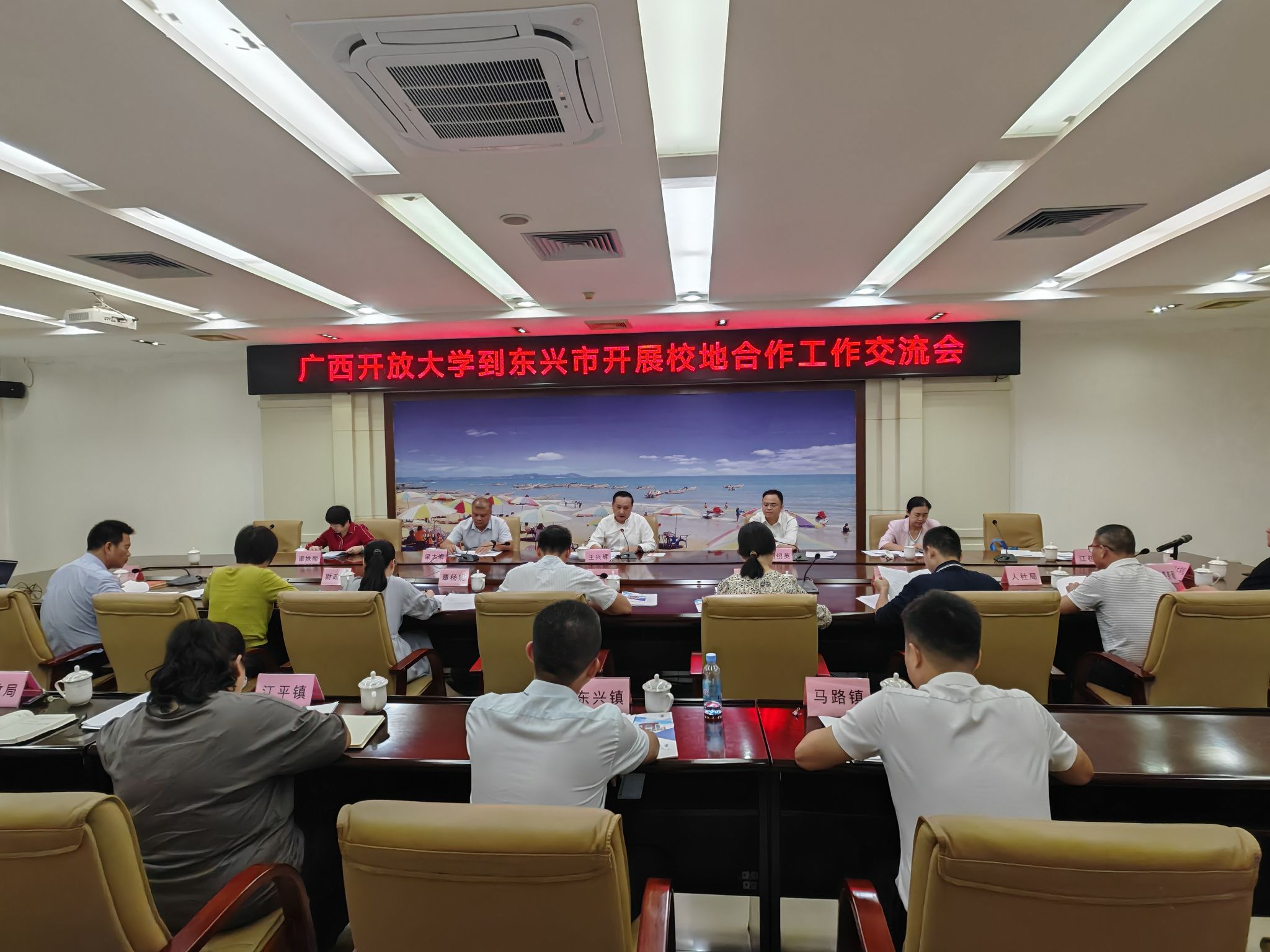 调研期间,王兴辉一行与东兴市委、市政府开展了座谈交流。王兴辉结合学校“一体两翼”融合发展工作实际,详细介绍了学校的办学历史、体系职能、办学模式、学历人才培养与非学历培训、构建服务广西全民终身学习的教育体系等情况,并重点说明了共建东兴开放大学,实现政校高质量发展的政策背景、主要内容和具体任务。