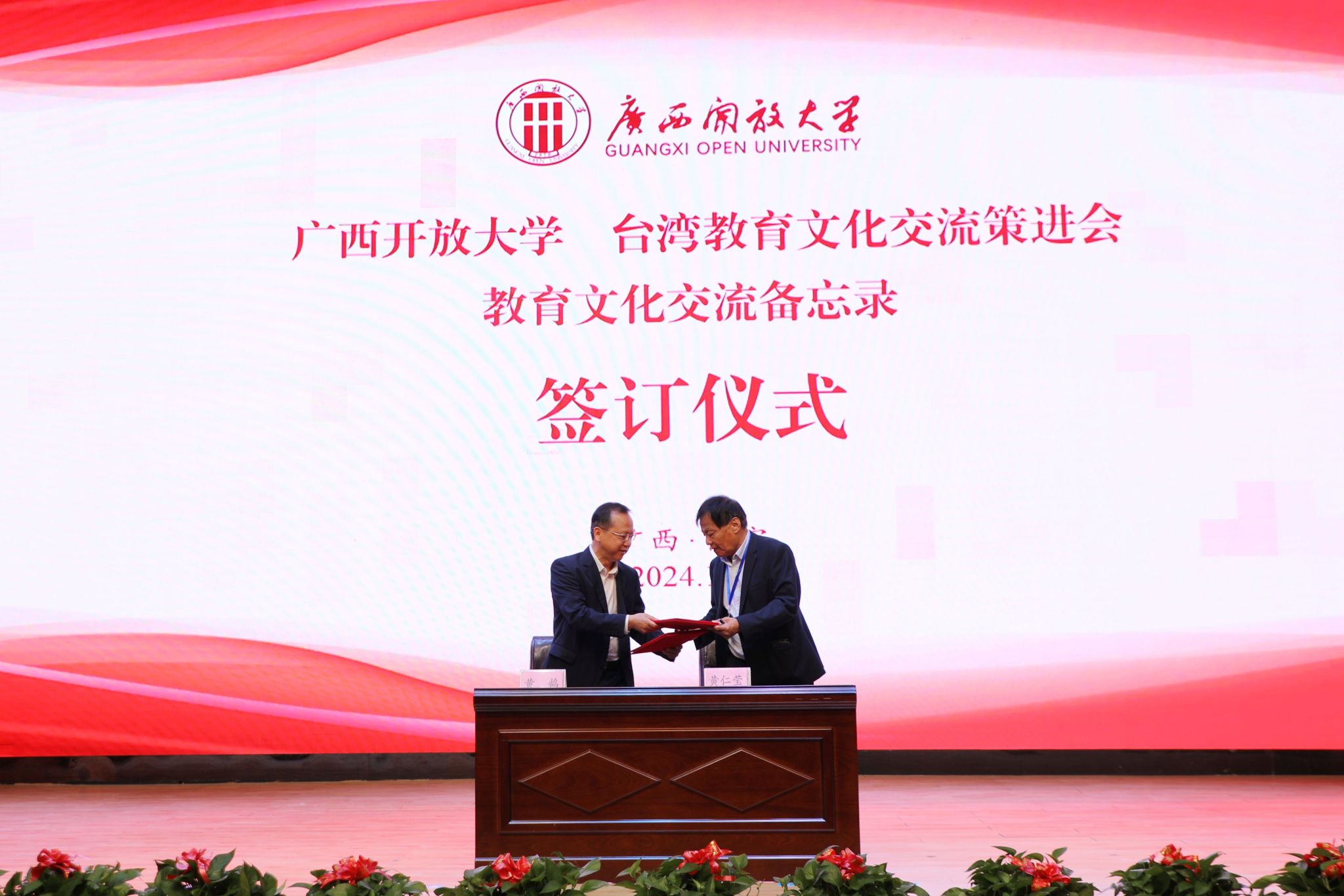 广西开放大学与台湾教育文化交流策进会在论坛上签订“教育文化交流备忘录”,就双方未来开展参访、交流、调查、研究活动,落实联合办学、老年人文化演艺研学等相关事项达成一致意见。