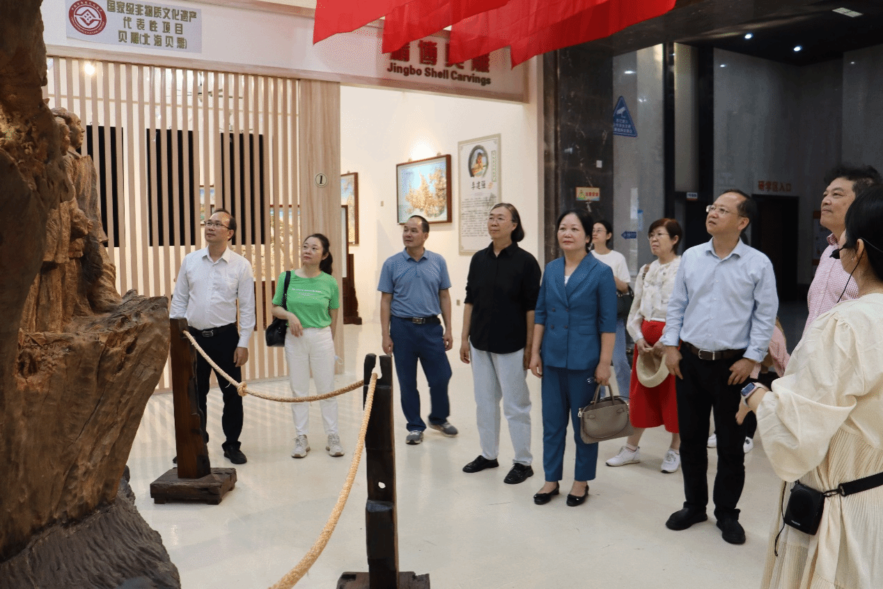当天下午,全体人员赴合浦县汉代文化博物馆参观学习,近距离观看了馆藏的青铜器、陶器、珠宝等丰富文化遗产,深入了解了作为汉代海上丝绸之路始发港合浦郡的辉煌历史发展,学习了马援、费贻和孟尝等多位清官廉吏的事迹,进一步以史为鉴勇担使命,用自律清风洗涤心灵。随后,大家来到海丝非物质文化遗产体验馆,进行了角雕、贝雕、乌木和硬木雕刻等海丝非遗文化的现场调研,开展了南流江玉石、赤江陶和小江瓷等产业经济发展考察,并与合浦县政协、县委统战部有关领导干部开展了交流学习。