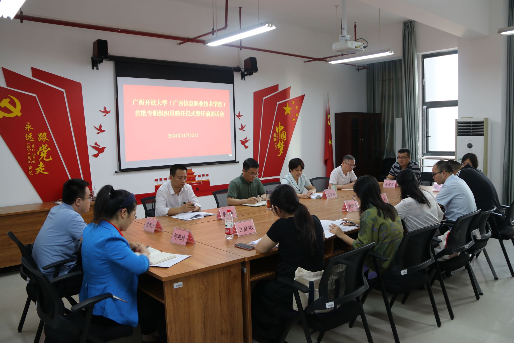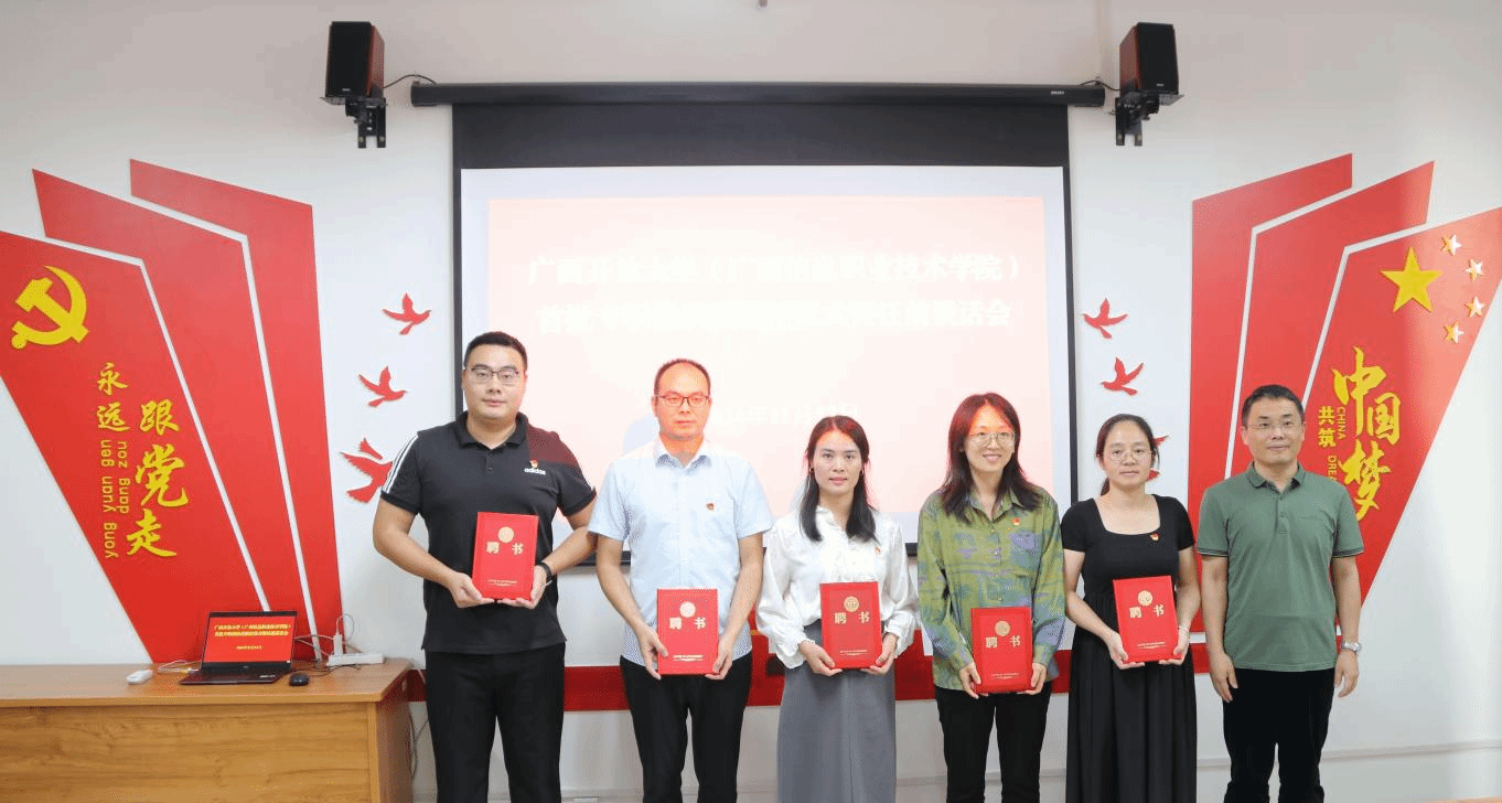 党委组织部 关振华报道 11月13日下午,我校在东宝校区远教大厦1011党建活动室举行首批专职组织员聘任仪式暨任前谈话会。学校党委委员、副校长辛立章出席会议并讲话,党委委员、组织部部长,广西信息职业技术学院党委副书记陈雪松,广西信息职业技术学院副院长李国助、陈广杰,相关二级学院党总支书记以及新聘任专职组织员参加会议。会议由陈雪松主持。