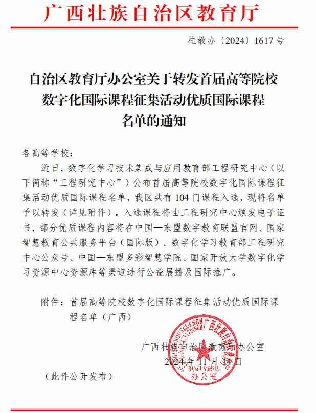 据悉,首届高等院校数字化国际课程征集活动优质国际课程是积极响应国家教育数字化战略行动集成化、智能化、国际化要求,进一步落实第三届中国—东盟教育部长圆桌会议成果文件精神、推进优质教育资源跨境共建共享的重要举措。本次征集活动共吸引264所高校参加,征集了涵盖传统文化、实践技能培训和数字素养等类型的777门课程参选,最终评出296门优质课程。