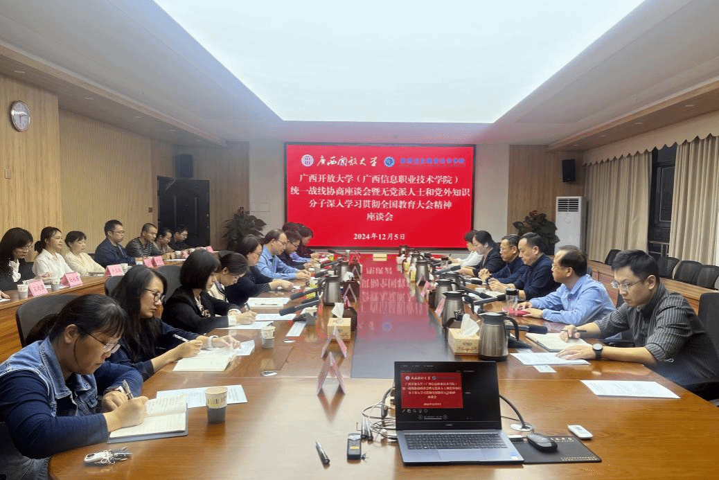 党委宣传部 杨红报道 12月5日,我校召开统一战线协商座谈会暨无党派人士和党外知识分子深入学习贯彻全国教育大会精神座谈会。校长王兴辉通报2024年学校重点工作情况,学校党委副书记龙雪津主持会议,副校长黄鹄,党校办、党委组织部、党委宣传部等部门负责人,民主党派成员、无党派人士和党外知识分子参加会议。