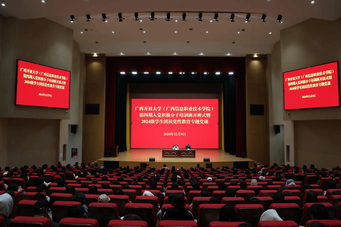 党委组织部 黄柳喜报道 12月9日下午,我校在五象校区学生活动中心举办了第四期入党积极分子培训班开班式暨2024级学生团员党性教育专题党课。党委委员、副校长辛立章,党委委员、组织部部长、广西信息职业技术学院党委副书记陈雪松,广西信息职业技术学院副院长李国助、陈广杰,各二级学院党总支书记、专职组织员、2024级学生专职辅导员、第四期入党积极分子培训班学员、2024级全体学生团员参加会议。开班式由辛立章主持。