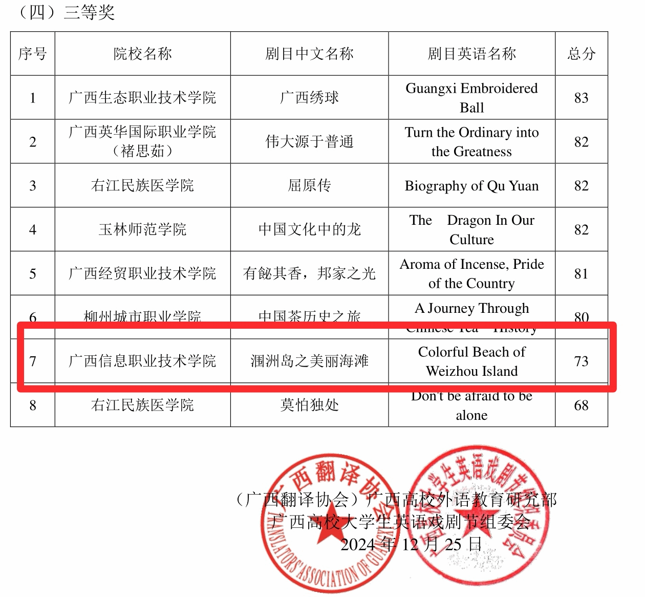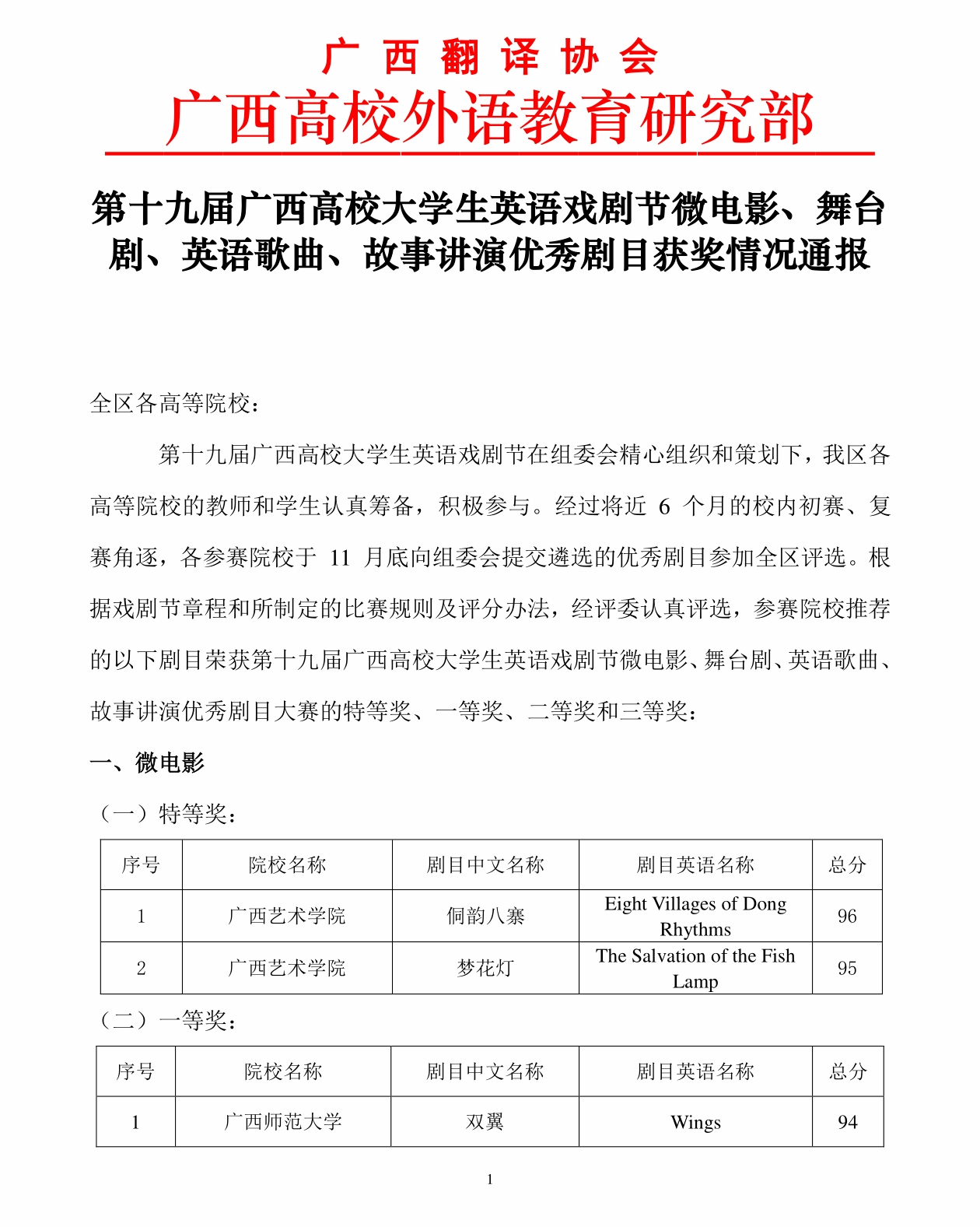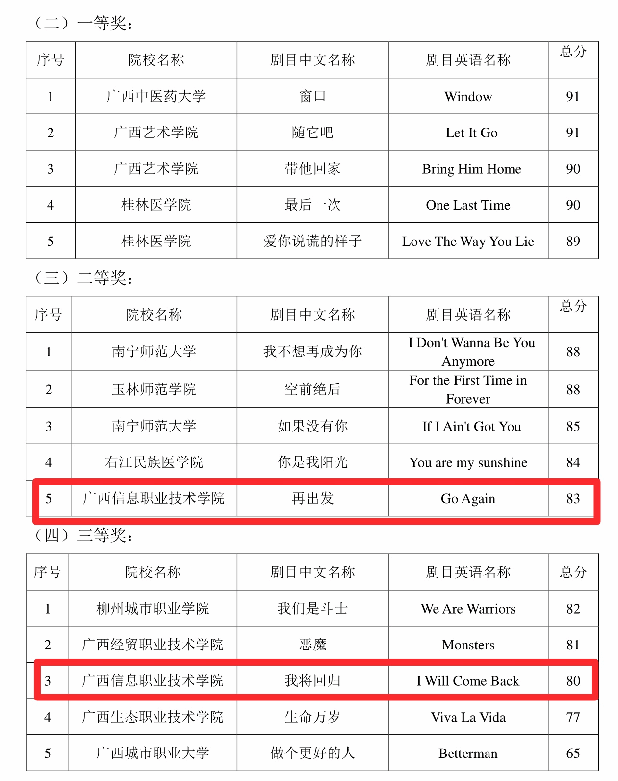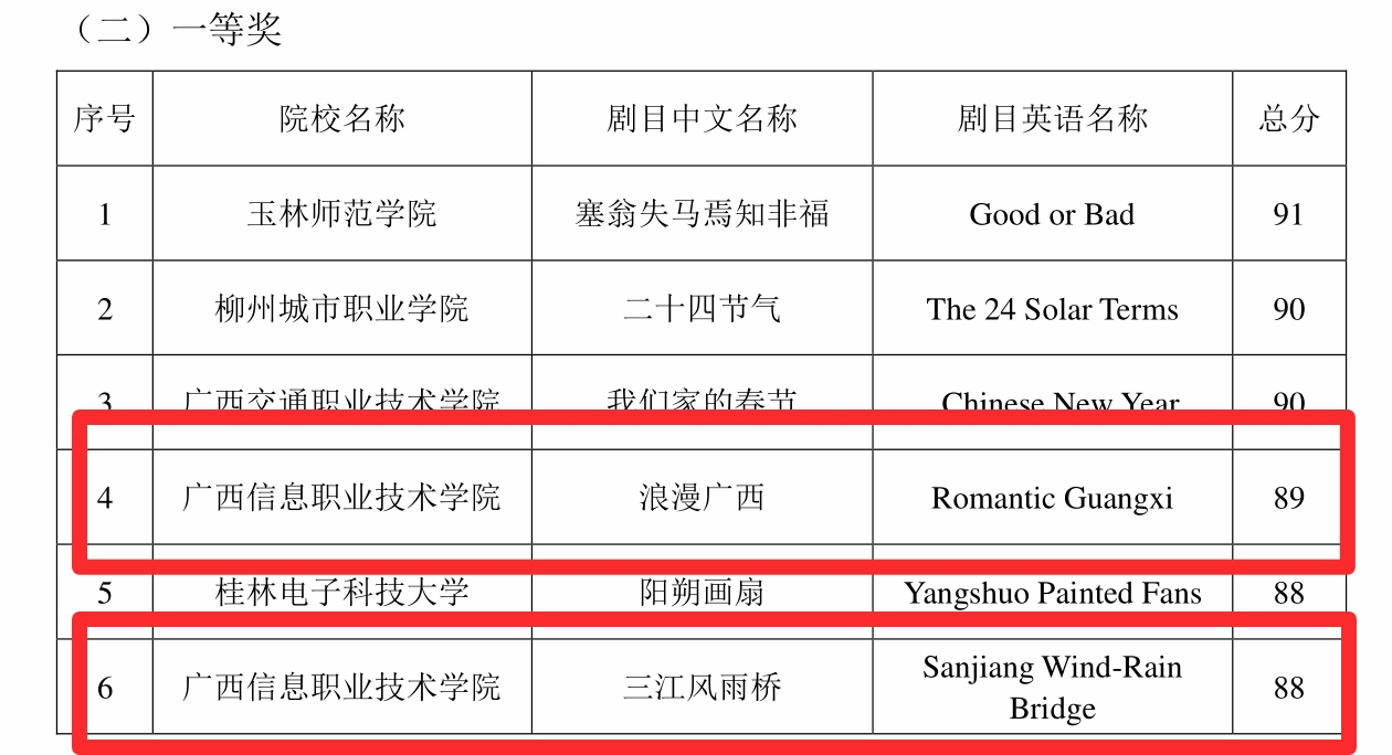 其中,英语故事讲演《Romantic Guangxi》(浪漫广西)和《Sanjiang Wind-Rain Bridge》(三江风雨桥)分获一等奖;英语歌曲《Go Again》(再出发)获二等奖;英语歌曲《I Will Come Back》(我将回归)和英语故事讲演《Colorful Beach of Weizhou Island》(涠洲岛之美丽海滩)分获三等奖。