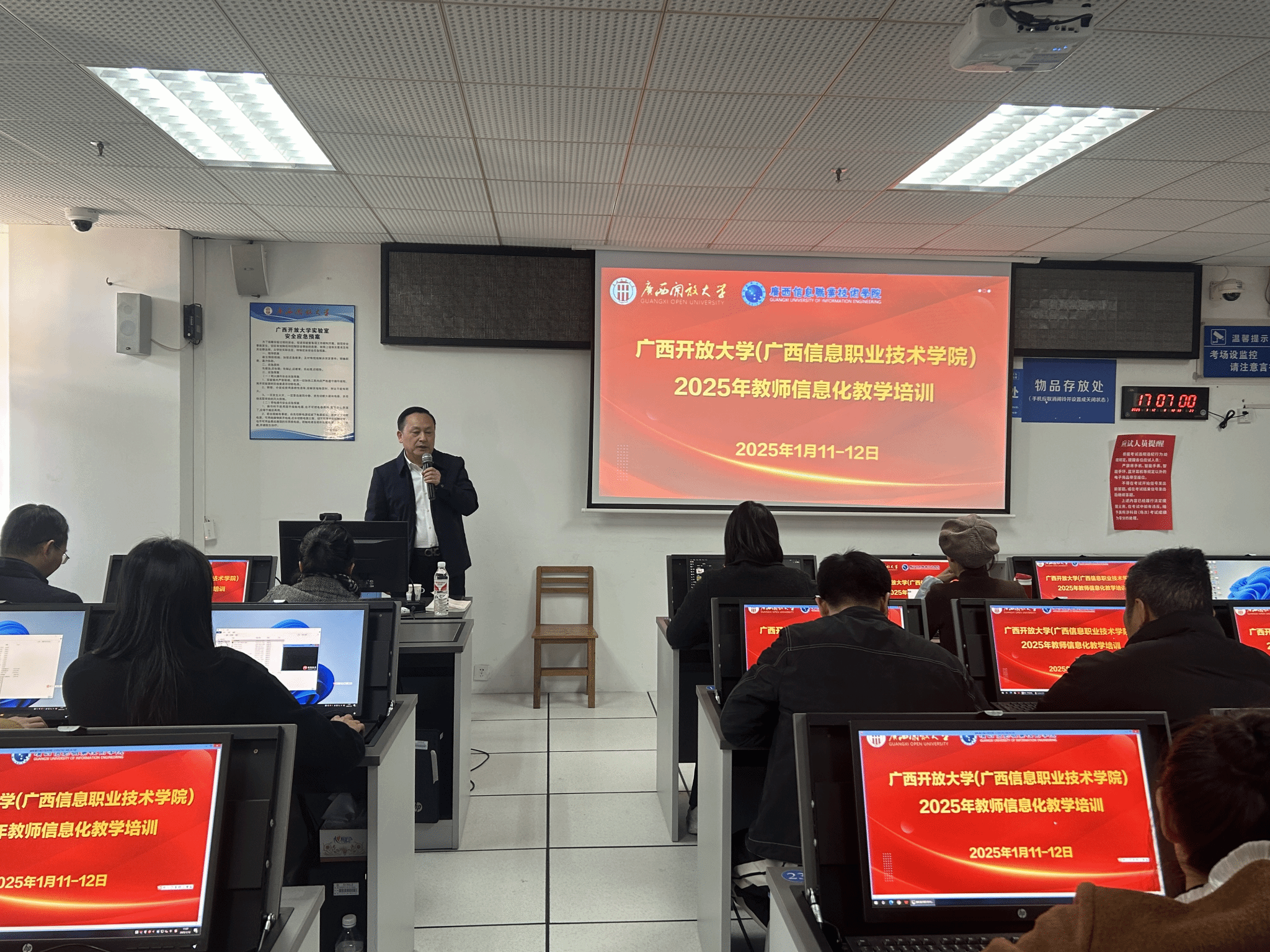 教务处 黄文进报道 为推动学校教育数字化转型,促进数字技术、人工智能与传统教育融合发展,提高教师数字技术应用能力,我校于2025年1月11日至12日开展了为期两天的教师培训活动。校长王兴辉参加开班仪式并讲话,广西信息职业技术学院副院长邓明学主持开班仪式,全体专任教师、兼课教师及部分其他教职工参加培训。