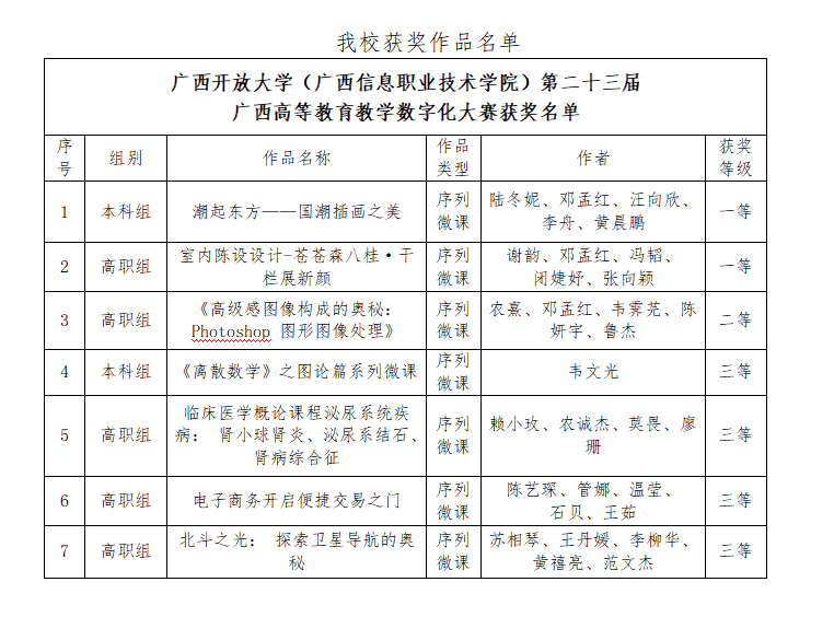 教务处 黄文进报道 近日,自治区教育厅公布了第二十三届广西高校教育教学数字化大赛最终成绩,我校教师凭借扎实的专业素养和教学能力在此次大赛中斩获 7 项大奖,其中,一等奖2项,二等奖1项,三等奖4项。本次成绩的取得,既是我校数字化领域教育教学工作成果的体现,也是参赛教师实力与风采的充分展现。