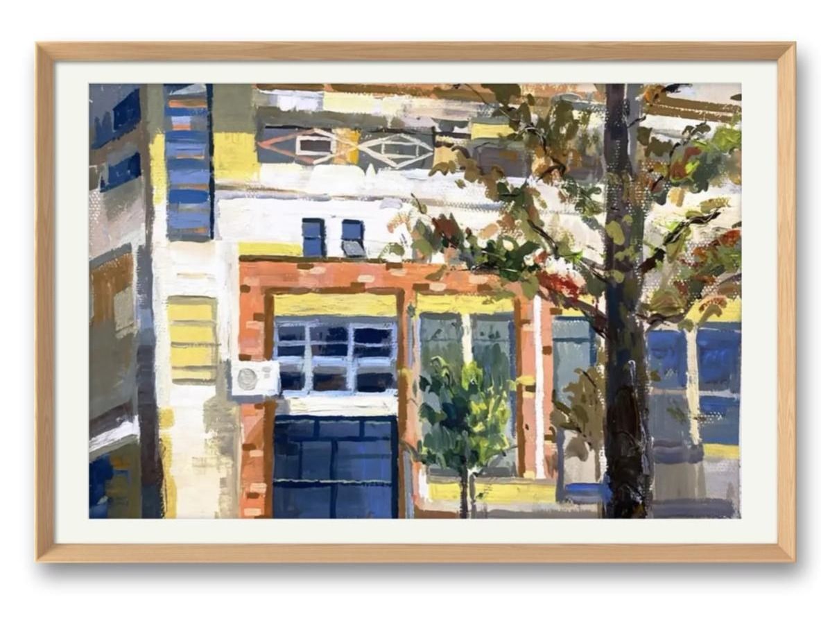 橙棕与粉紫的7:3色块对撞,左前写实绿树如歌圩休止符
