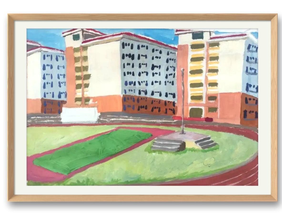 碧绿球场叠壮锦菱纹,红跑道拟红绸舞轨迹,国旗杆系彩蛋随风吟