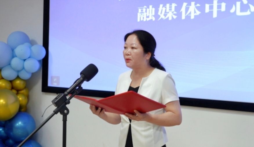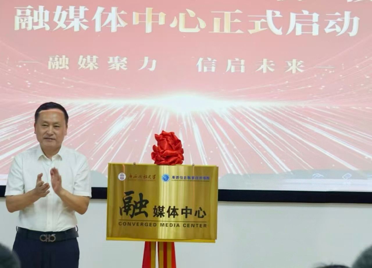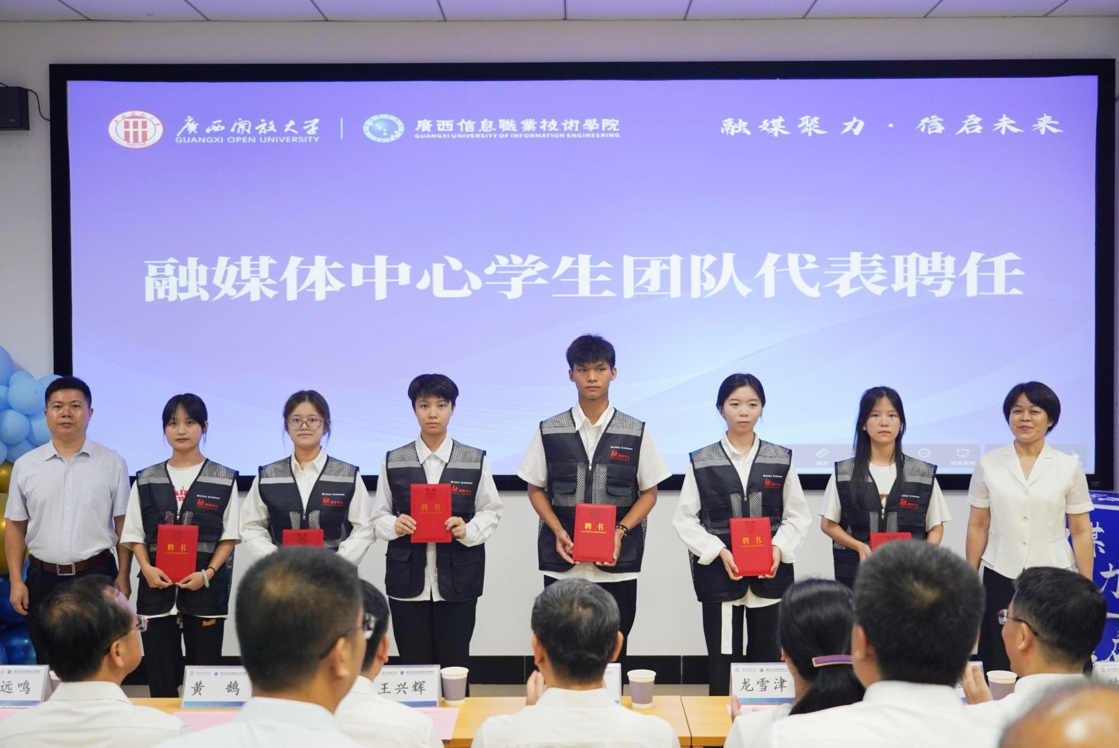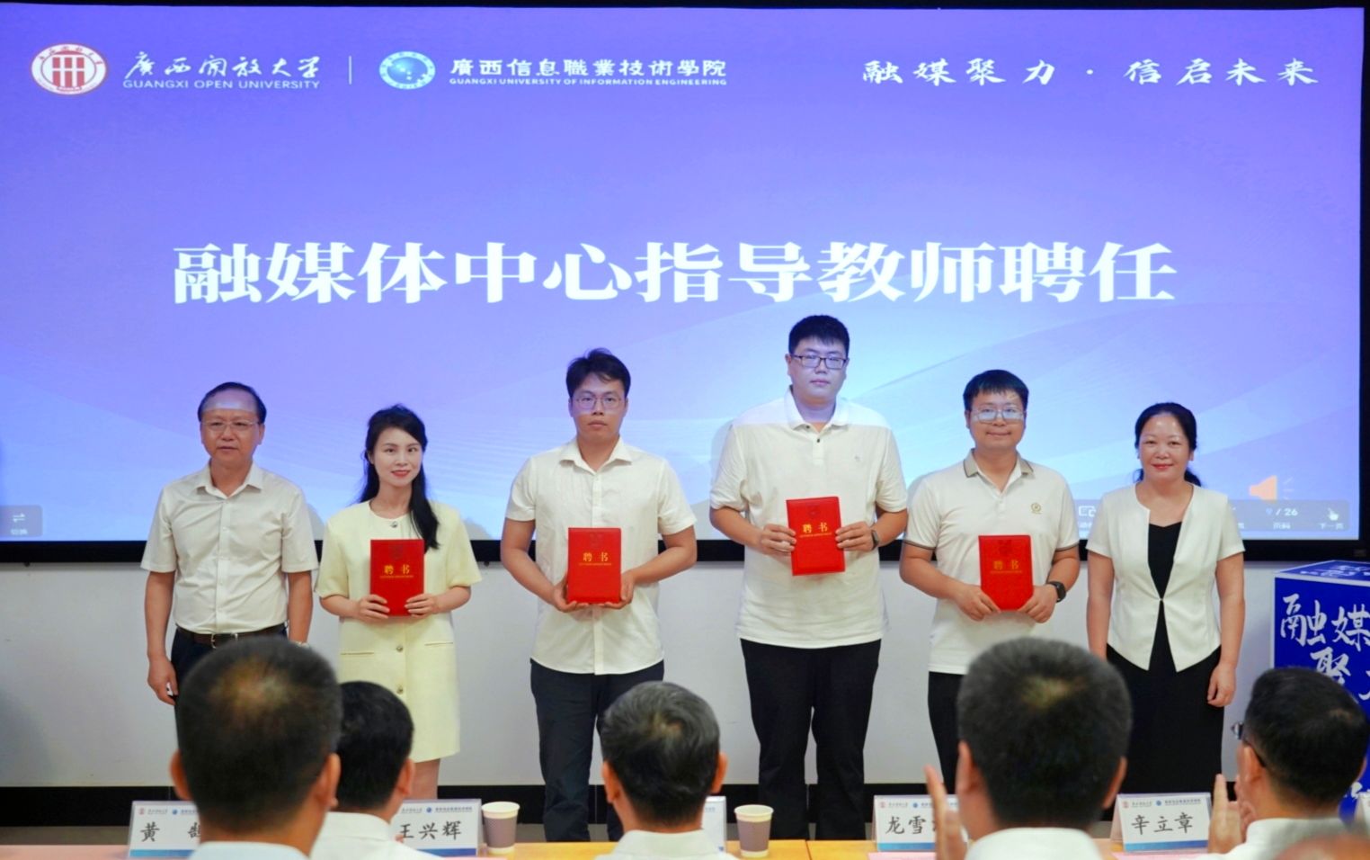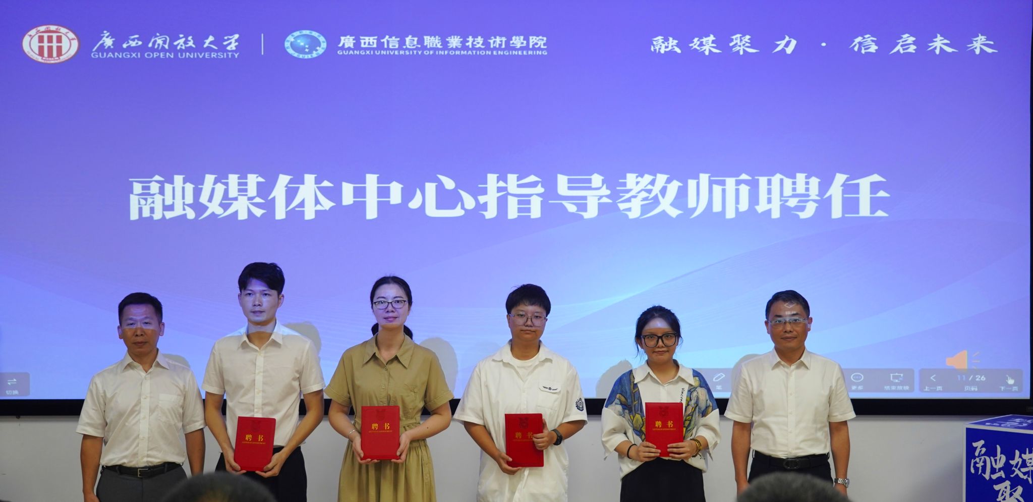 党委宣传部 报道 融媒聚力·信启未来。6月27日,学校举行融媒体中心揭牌仪式。学校校长王兴辉出席仪式并为融媒体中心揭牌,党委副书记龙雪津宣读《关于成立广西开放大学(广西信息职业技术学院)融媒体中心的通知》并为指导教师颁发聘书,副校长黄鹄、辛立章、黄远鸣为指导教师颁发聘书。
