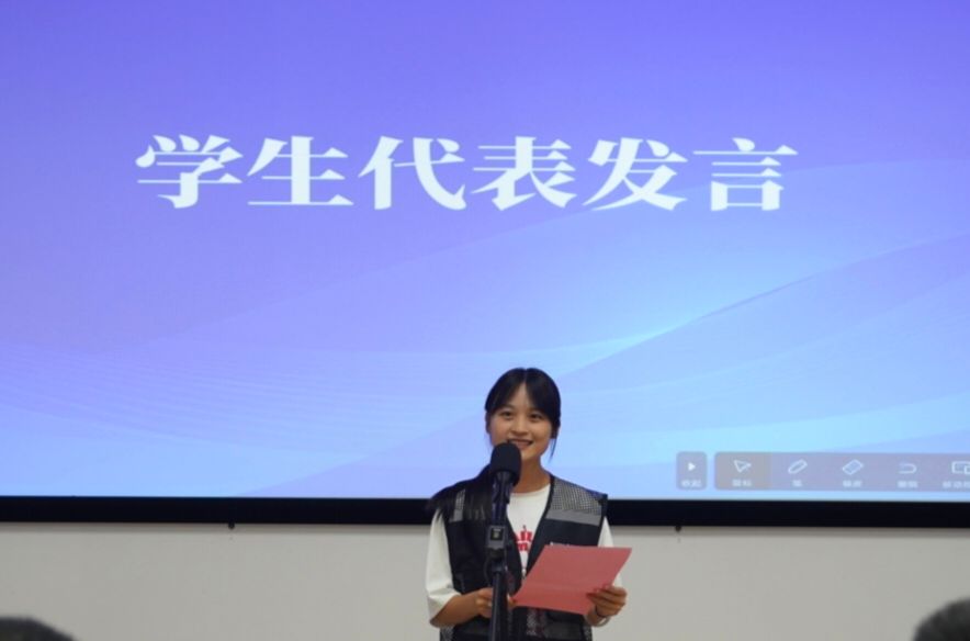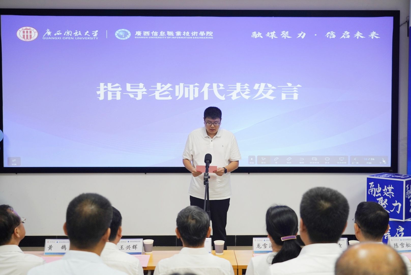仪式上,广西信息职业技术学院党委副书记陈雪松、学校党委宣传部部长胡峥嵘为融媒体中心学生团队代表颁发证书。数字艺术与传媒学院黄晨鹏作为指导教师代表发言,指出融媒体中心的成立,将为学生们提供真实的媒体环境与项目资源。学生们将在参与新闻采编、视频制作、新媒体运营等全流程工作中,将课堂所学知识转化为实际技能。2024级影视多媒体技术3班李元怡作为学生代表发言,她热切期待融媒体中心成为提升专业能力的重要阶梯,让同学们通过参与校园新闻报道、专题视频制作等实践工作,将课堂所学转化为实际技能,同时积累实战经验,为未来职业发展奠定坚实基础。