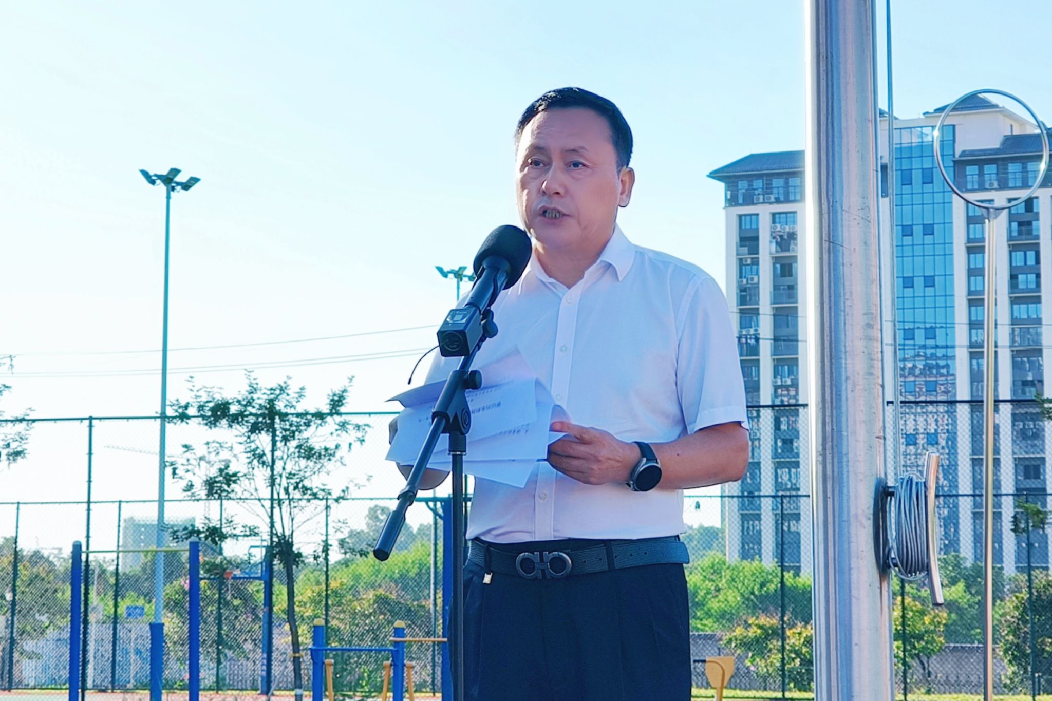 党委宣传部 杨红 报道 9月1日,学校举行2025年秋季学期开学升旗仪式暨“开学第一课”。国旗下,校长王兴辉作《铭记历史担使命 AI赋能启新程》主题授课。党委副书记龙雪津主持仪式。全体学校领导、中层干部、五象校区全体教职工和全体在校学生参加升国旗仪式并聆听了“开学第一课”。