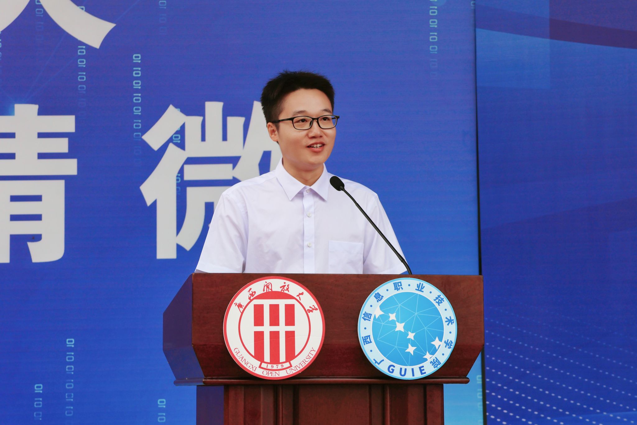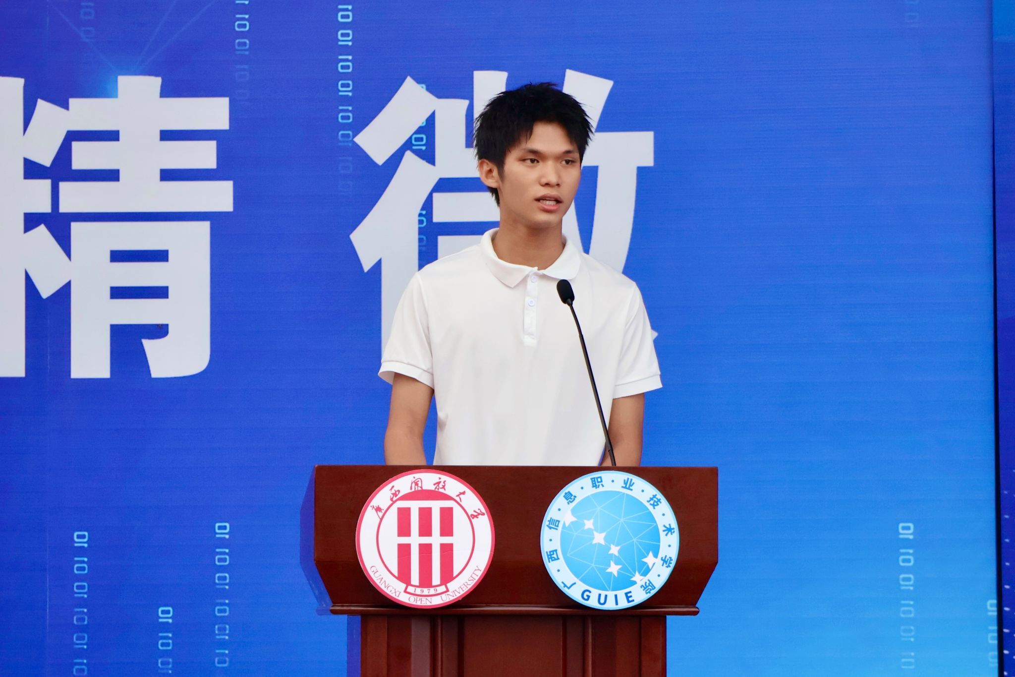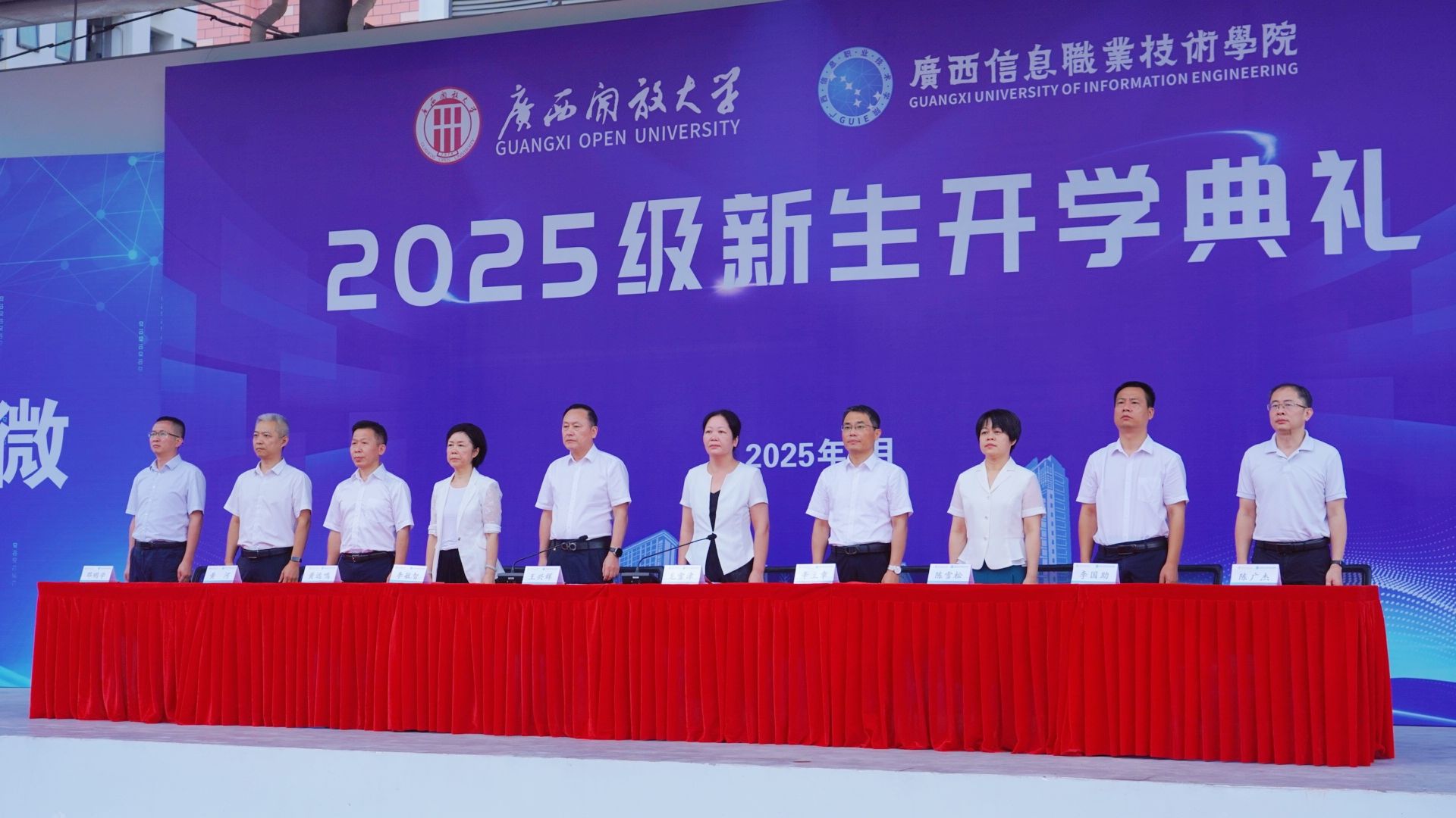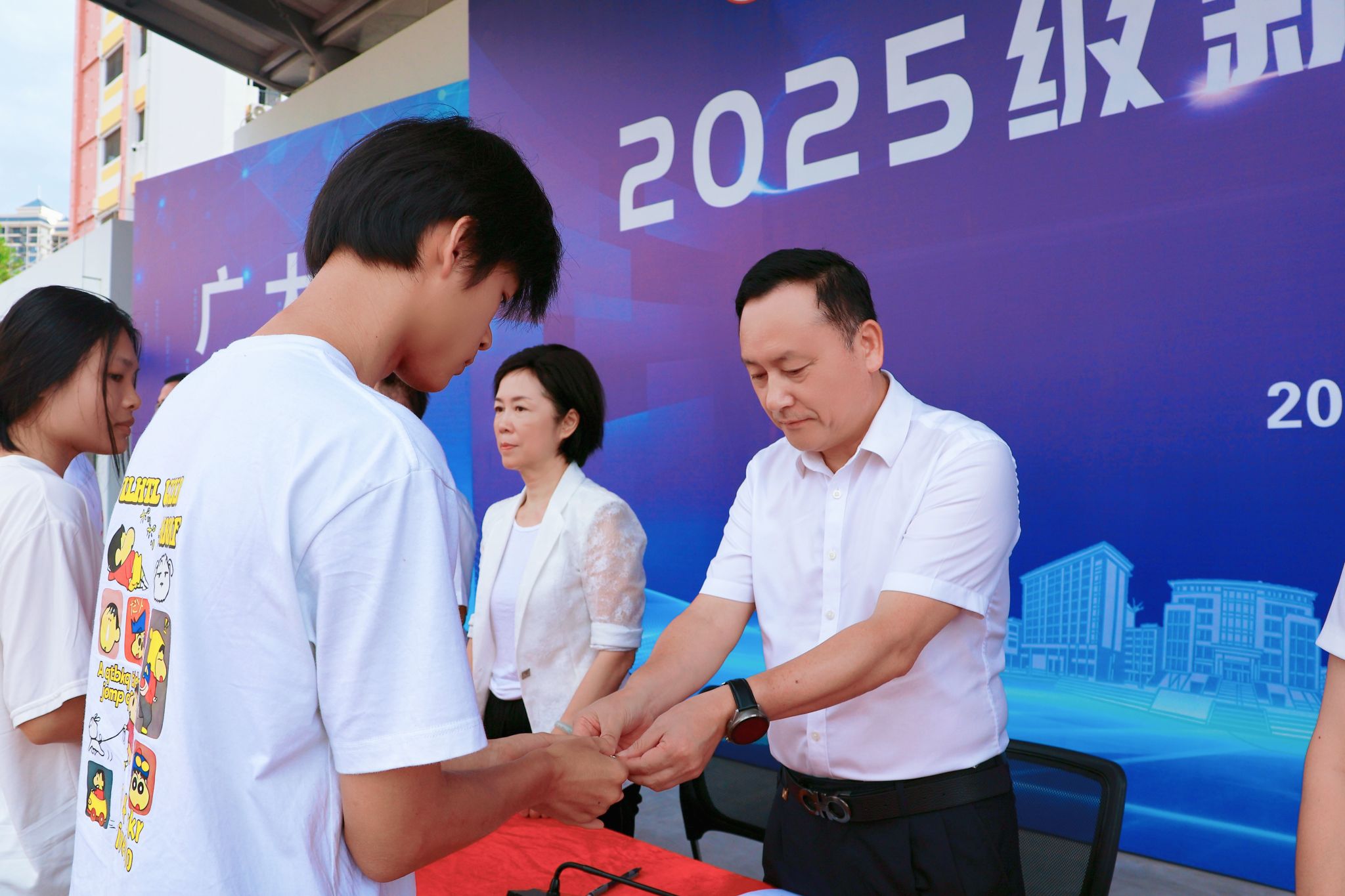 学校领导为新生代表授予学校徽章。广西信息职业技术学院党委副书记陈雪松,副院长黄河、李国助、邓明学、陈广杰,各二级学院领导班子、2025级新生班级班主任、辅导员,以及2025级全体新生参加了开学典礼。
