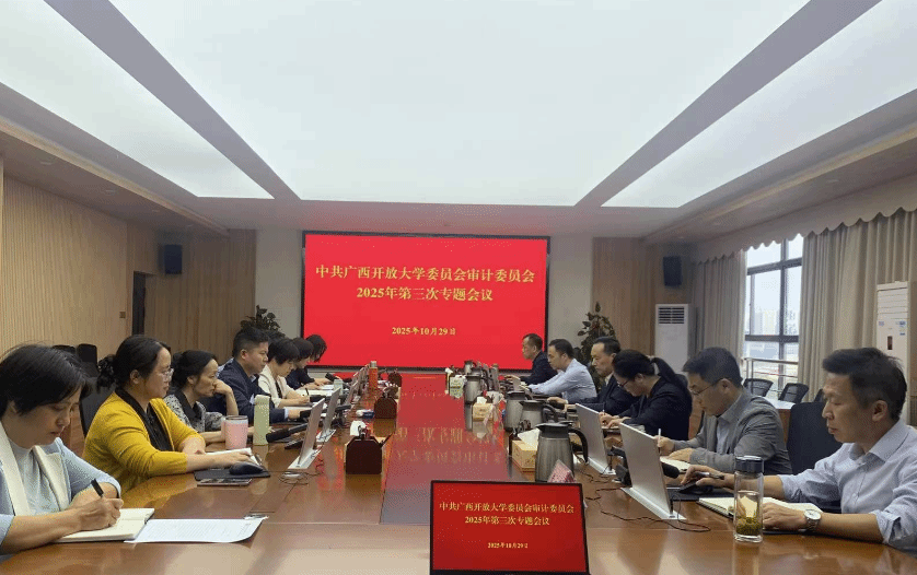 党委审计委员会办公室 农盛霖 报道 10月29日下午,中共广西开放大学委员会审计委员会2025年第三次专题会议在东宝校区远教大厦召开。学校审计委员会主任、校长王兴辉出席并主持会议,党委副书记龙雪津,学校领导刘绍英、辛立章、侯宗毅、黄远鸣出席会议,审计委员会各成员单位主要负责人参加会议。