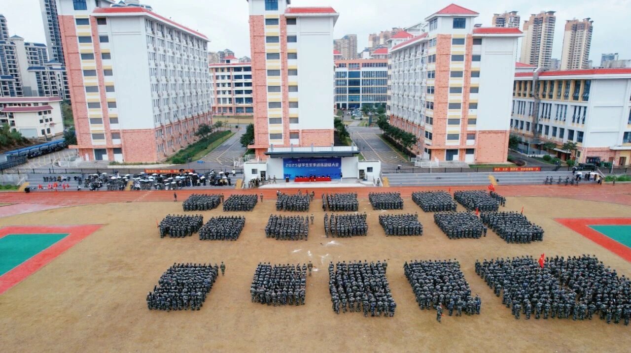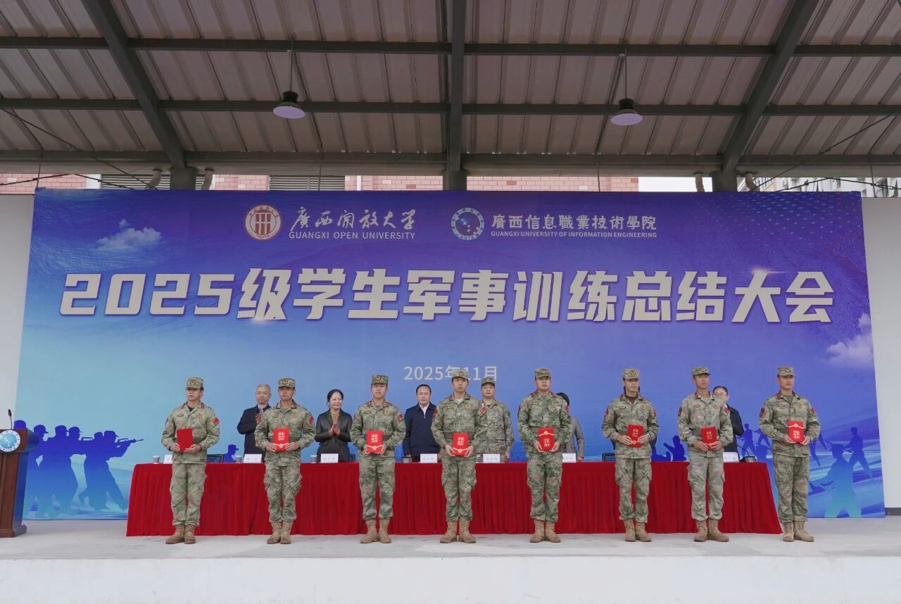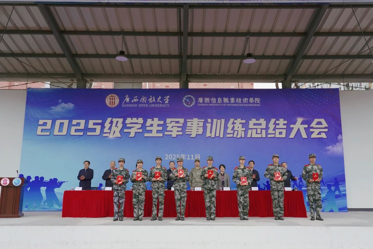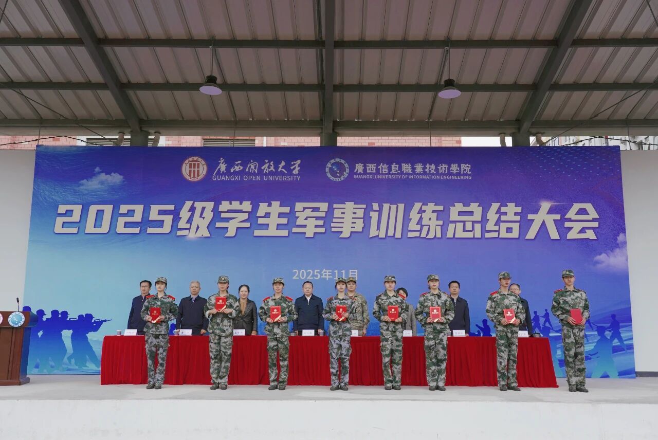 学生工作部、团委、武装部 王素琴 报道 “青春铸军魂,奋进新征程!”11月18日上午,学校五象校区田径运动场上旌旗飘扬、气势昂扬,2025级学生军训总结大会在此举行。校长王兴辉作总结讲话,党委副书记龙雪津宣读军训表彰文件,邕宁区人民武装部部长陈金同参加大会并讲话。广西信息职业技术学院党委副书记陈雪松、副院长黄河、李国助、邓明学参加大会,副院长陈广杰主持大会。