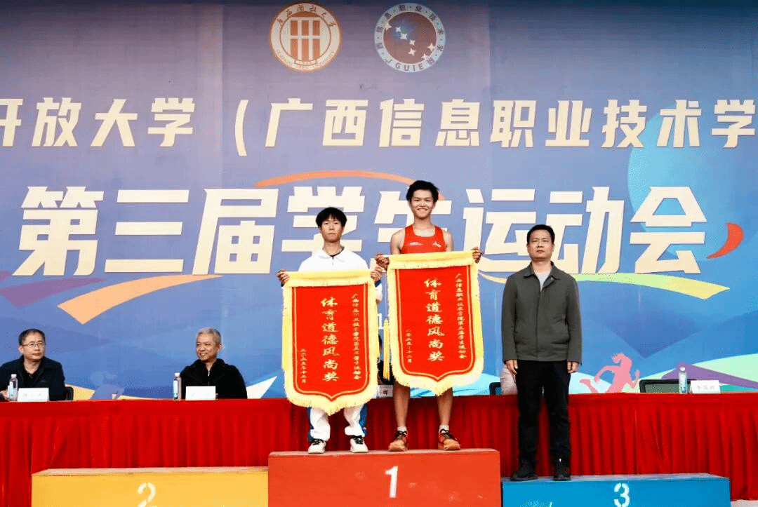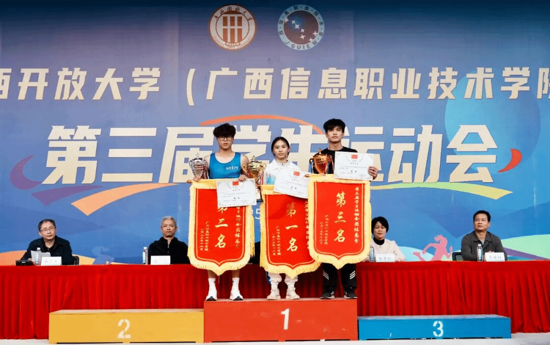 裁判长、通识教育学院教师陈采铃宣布运动会比赛成绩。本次比赛共设置100米、200米、400米、800米、1500米、跳高、跳远、铅球、4*100米接力、4*300米接力、20*50米接力、毽球、高杆抛绣球、三人板鞋竞速、羽毛球混合团体赛、乒乓球混合团体赛,共计16项比赛。经过两天的激烈比拼,按照比赛项目的设置以及男女生分组,共约620人次获奖;数字经济与管理学院、北斗与通信学院(智能制造学院)、数字艺术与传媒学院获团体总分前三名;北斗与通信学院(智能制造学院)、数字经济与管理学院获“道德风尚”奖;计算机与人工智能学院、数字艺术与传媒学院获“优秀组织奖”。