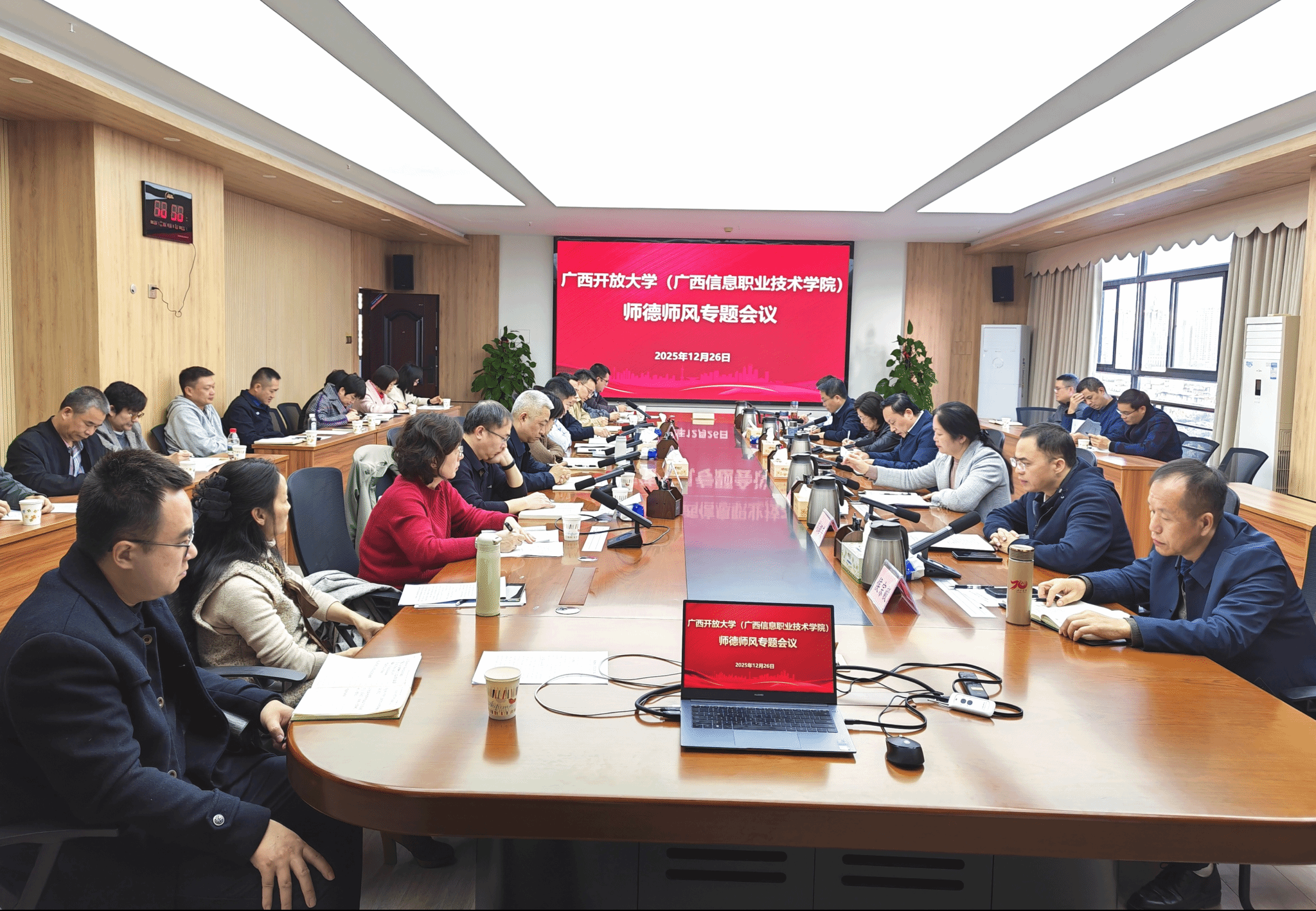 党委教师工作部、人事处 韦焕春 报道 12月26日下午,学校在东宝校区远教大厦召开2025年师德师风工作专题会。广西开放大学全体校领导、广西信息职业技术学院院级副职领导及各二级单位负责人、各二级学院党总支书记参加会议。会议由学校党委委员、副校长辛立章主持。