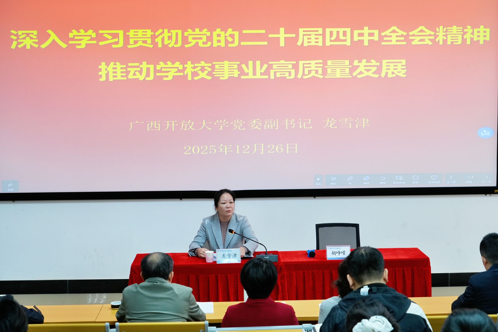 龙雪津指出,党的二十届四中全会是在我国迈向全面建设社会主义现代化国家新征程、向第二个百年奋斗目标进军的关键时刻召开的一次十分重要的会议。她表示,持续深入学习贯彻党的二十届四中全会精神,要谋划好“十五五”时期的发展,紧密结合学校发展实际,把握政策利好机遇、需求驱动机遇、数字赋能重塑教育发展机遇,充分发挥学校数字化优势,在时代发展大潮中,奋力开创高质量发展新局面。要清醒认识到学校当前在内涵发展与提质增效、生源市场竞争、数智赋能突破、办学体系协同效能等方面面临的挑战,推动办学逻辑从“以量谋大”向“以质图强”的根本转变。要科学应变,主动服务和融入中国式现代化广西新篇章建设,努力把学校建设成为广西终身教育体系建设的核心力量、广西高素质技术技能人才培养的重要基地、广西教育数字化转型的实践基地,力争早日建成特色鲜明的区域性高水平新型大学。