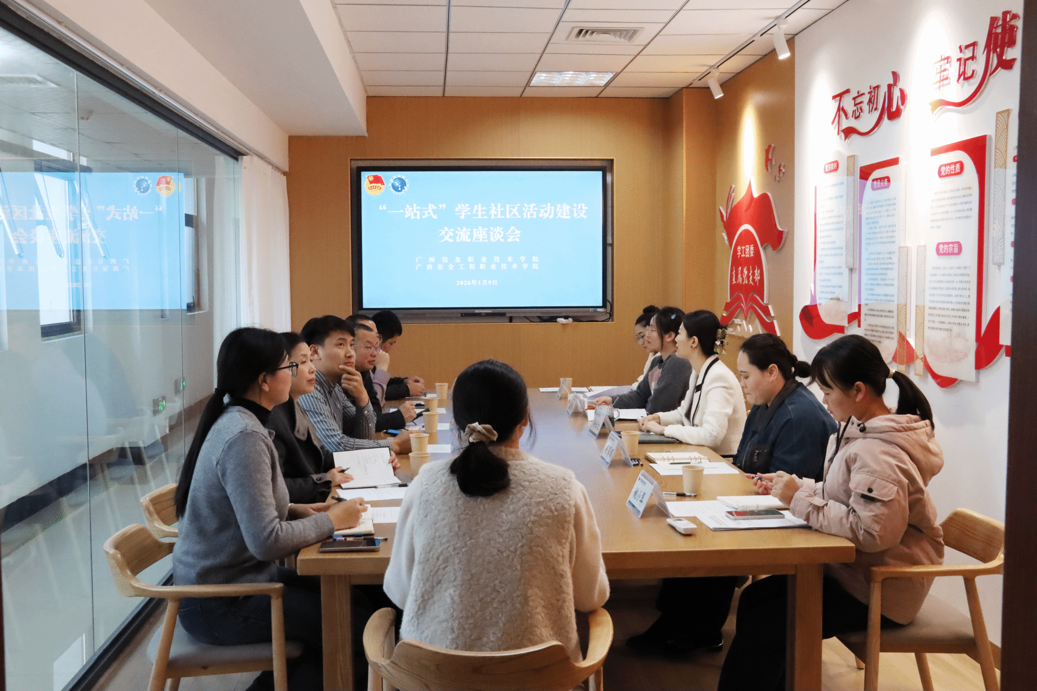 学校团委 温舒琳 报道 1月9日,广西安全工程职业技术学院学生工作部部长余崇柳、团委负责人黎林聪一行七人到我校专题调研,围绕“一站式”学生社区建设、学生社团规范化管理、校园活动品牌打造、学生会干部培养等主题开展交流。我校学生工作部、团委及二级学院团学负责同志参加座谈会。