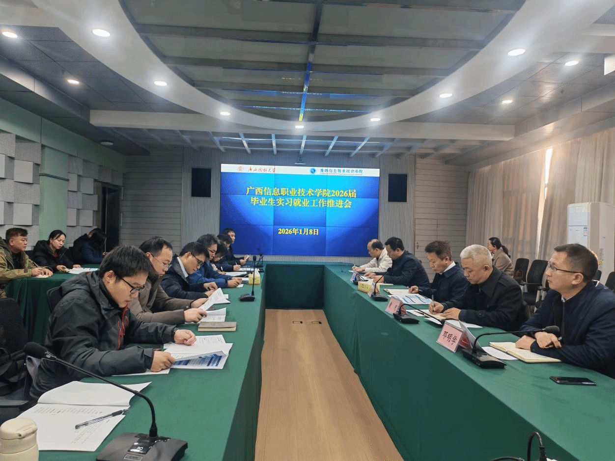 教务处(招生就业处) 黄永旺 报道 为总结2025届毕业生就业工作经验,全面部署2026届毕业生实习就业工作,1月8日上午,我校在东宝校区召开2026届毕业生实习就业工作推进会。副校长黄远鸣,广西信息职业技术学院副院长黄河、李国助、邓明学,教务处(招生就业处)、各二级学院负责人及相关工作人员参加会议。会议由邓明学主持。