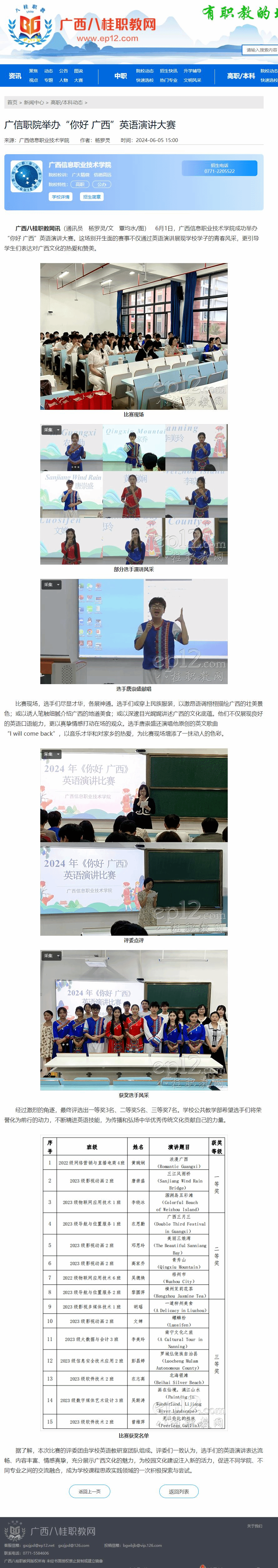 党委宣传部 报道 2024年6月5日,广西八桂职教网以“广信职院举办‘你好 广西’英语演讲大赛”为题,报道学校举办“你好 广西”英语演讲大赛情况。现将报道转载如下。