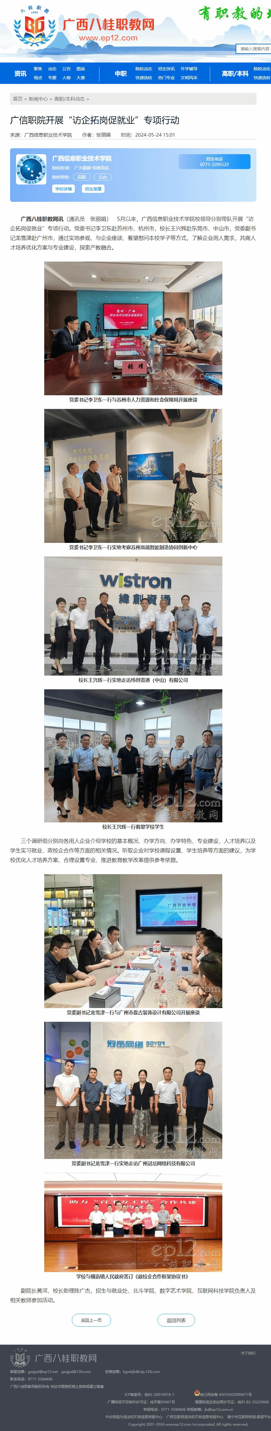 党委宣传部 报道 2024年5月24日,广西八桂职教网以“广信职院开展‘访企拓岗促就业’专项行动”为题,报道学校开展“访企拓岗促就业”专项行动工作情况。现将报道转载如下。