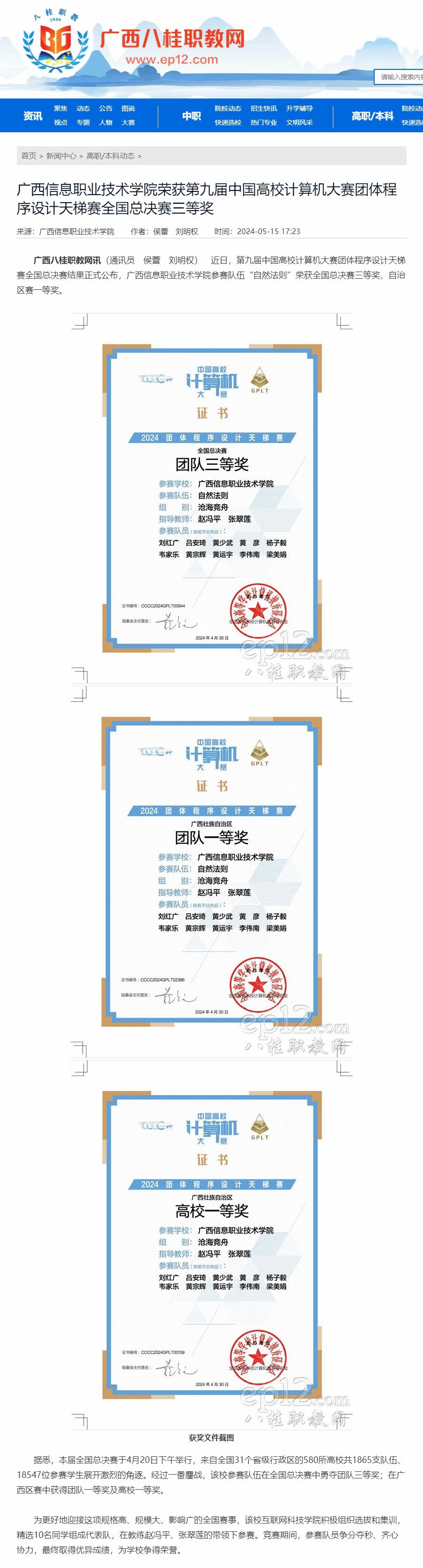 党委宣传部 报道 2024年5月15日,广西八桂职教网以“广西信息职业技术学院荣获第九届中国高校计算机大赛团体程序设计天梯赛全国总决赛三等奖”为题,报道我校在第九届中国高校计算机大赛团体程序设计天梯赛获奖情况。现将报道转载如下。
