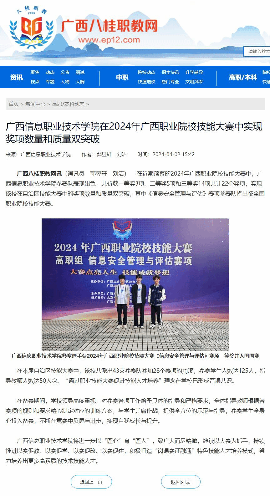 党委宣传部 报道 2024年4月2日,广西八桂职教网以“广西信息职业技术学院在2024年广西职业院校技能大赛中实现奖项数量和质量双突破”为题,报道我校在2024年广西职业院校技能大赛获奖情况。现将报道转载如下。