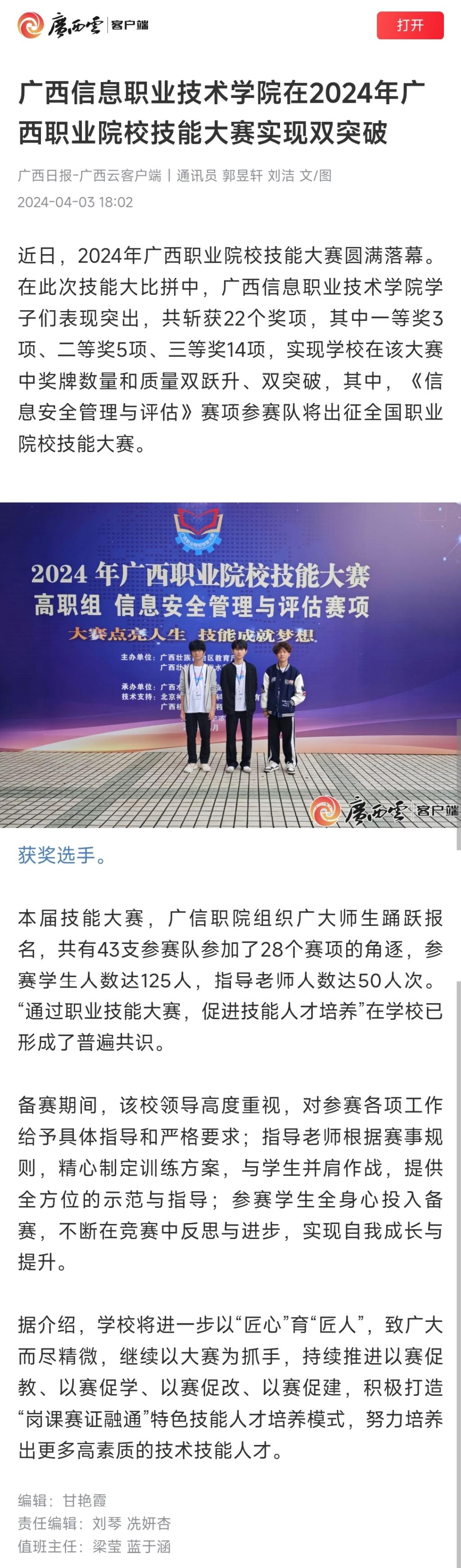 党委宣传部 报道 2024年4月3日,广西日报-广西云以“广西信息职业技术学院在2024年广西职业院校技能大赛实现双突破”为题,报道我校在2024年广西职业院校技能大赛获奖情况。现将报道转载如下。
