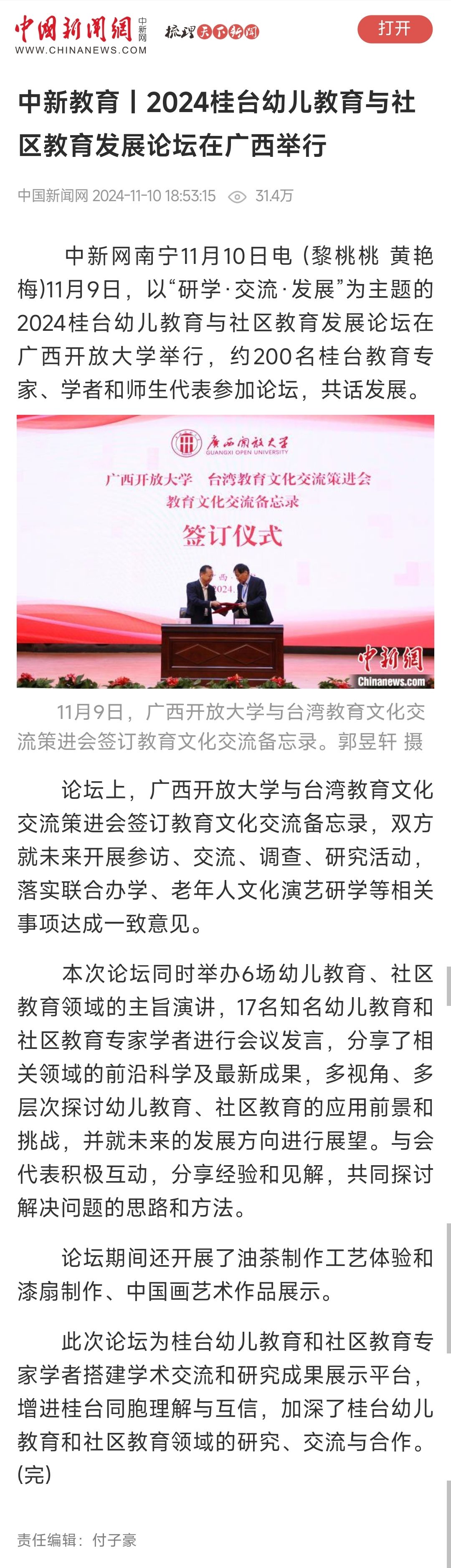 党委宣传部 报道 11月10日,中国新闻网以“中新教育丨2024桂台幼儿教育与社区教育发展论坛在广西举行”为题,报道论坛在我校召开的相关情况。现将报道转载如下。