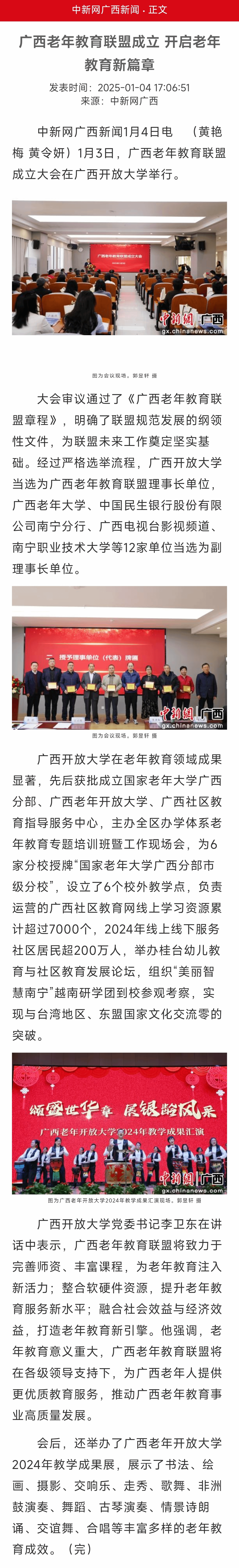 党委宣传部 报道 1月3日,中国新闻网以“广西老年教育联盟成立 开启老年教育新篇章”为题,报道我校举行广西老年教育联盟成立大会相关情况。现将报道转载如下。