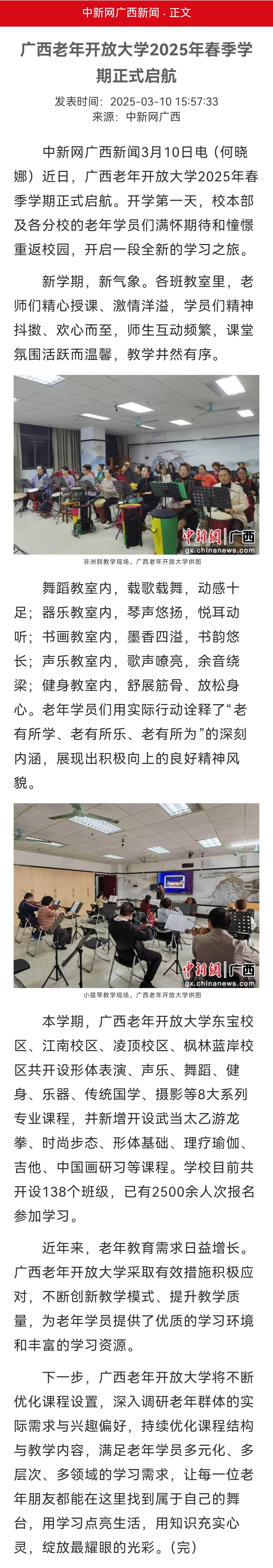 3月10日,中国新闻网以“广西老年开放大学2025年春季学期正式启航”为题,报道广西老年开放大学新学期开学相关情况。现将报道转载如下。