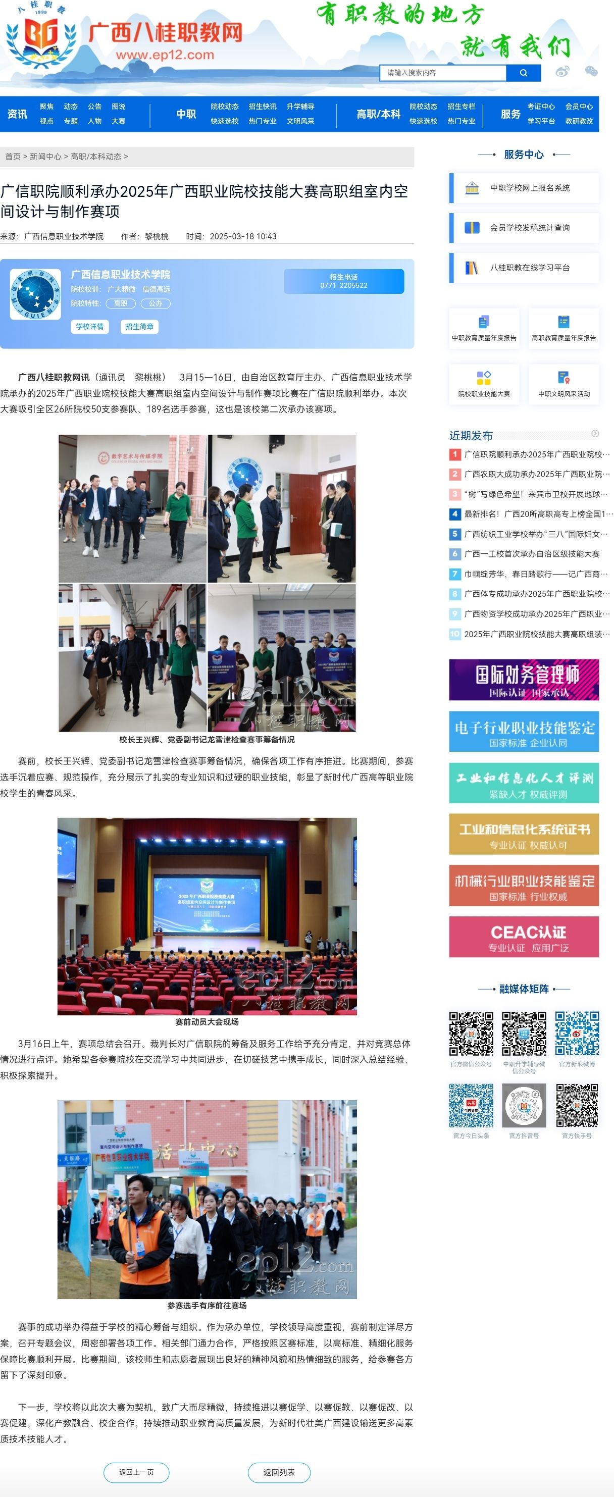 3月18日,广西八桂职教网以“广信职院顺利承办2025年广西职业院校技能大赛高职组室内空间设计与制作赛项”为题,报道我校承办比赛相关情况。现将报道转载如下。