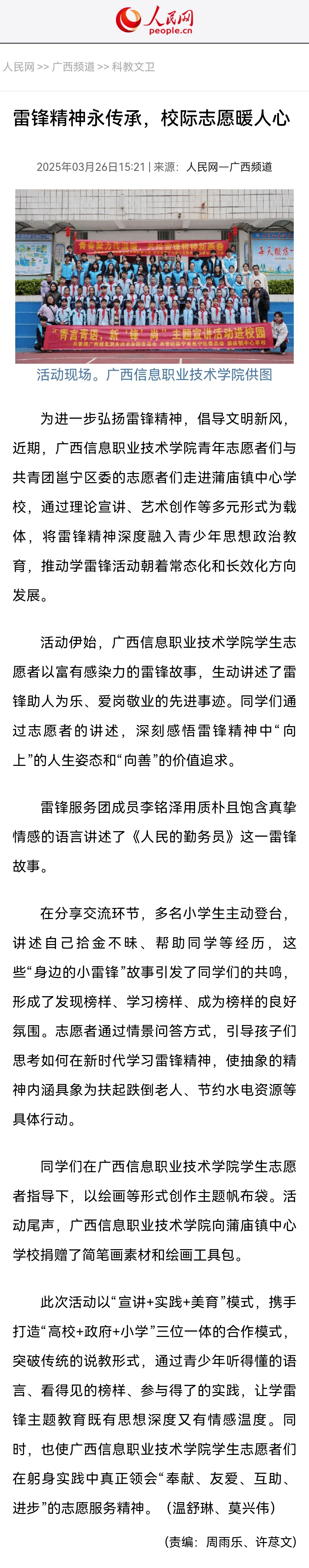 3月26日,人民网-广西频道以“雷锋精神永传承,校际志愿暖人心”为题,报道我校学雷锋活动相关情况。现将报道转载如下。