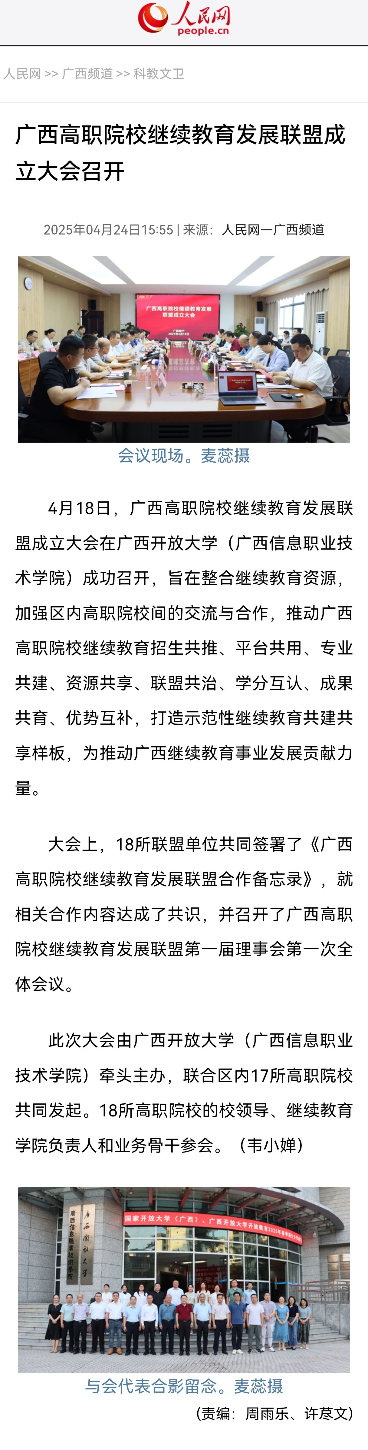 4月24日,人民网-广西频道以“广西高职院校继续教育发展联盟成立大会召开”为题,报道了广西高职院校继续教育发展联盟成立大会在我校召开的相关情况。现将报道转载如下。